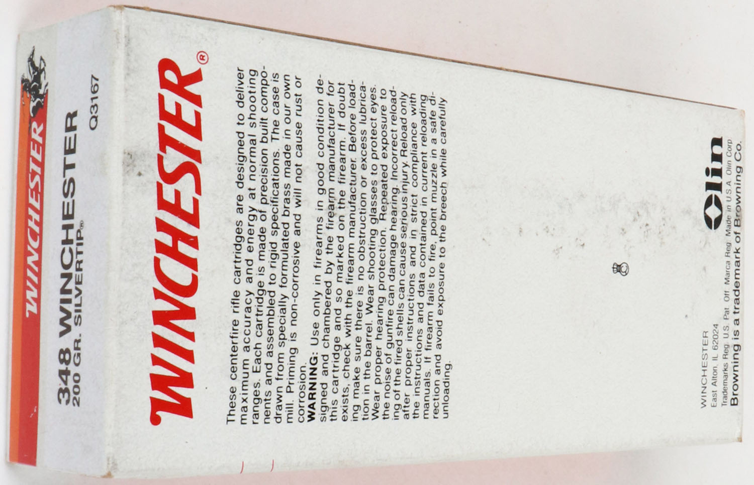 Winchester, Super-X, Commemorative Ammunition for Browning Model '71, .348 Winchester, 200 Gr. Silvertip, Full, 1pc. White black & red box, box is solid with excellent color, very minor shelf & corner wear, edges are crisp, end flaps are solid, ammo is excellent. Grade: Excellent + - Value: 40 to 120