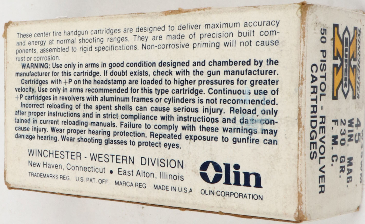 Winchester, Super X, .45 Win. Mag., 230 Gr. F.M.C., Partial 49rds., 1pc. White orange & blue box, box is solid with very good color, very minor age soiling, price stickers on top, some edge & corner wear, end flaps are solid, ammo is excellent to minty. Grade: Very Good ++ - Value: 20 to 80