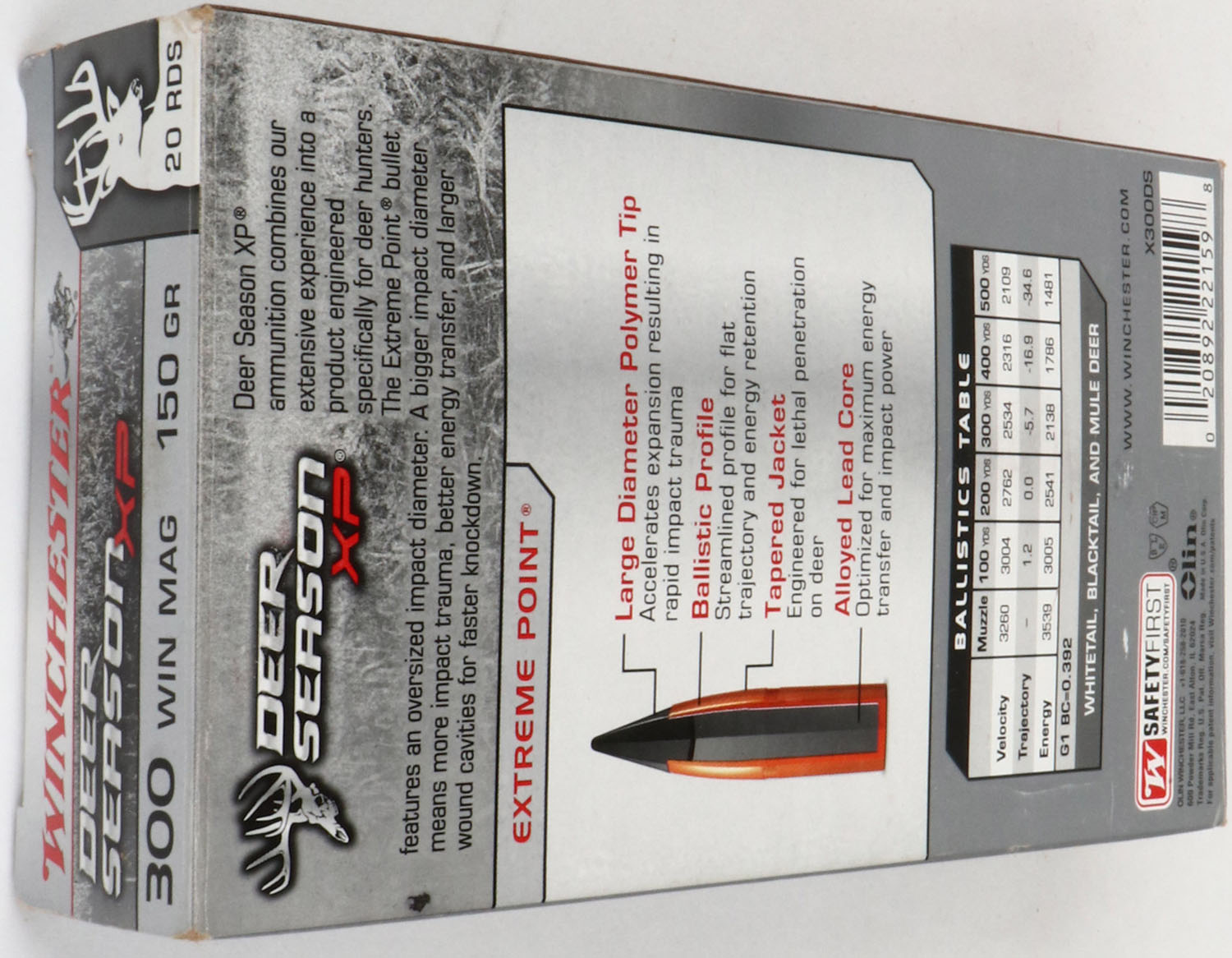 Winchester, Deer Season XP, .300 Win. Mag., 150 Grain Extreme Point, Partial 17rds. Correct (3 incorrect Weatherby .300 Magnum rds.), 1pc. Silver gray & red box, box is solid with minty color, very minor corner wear, edges are crisp, end flaps are solid, ammo is minty. Grade: Excellent + - Value: 10 to 50