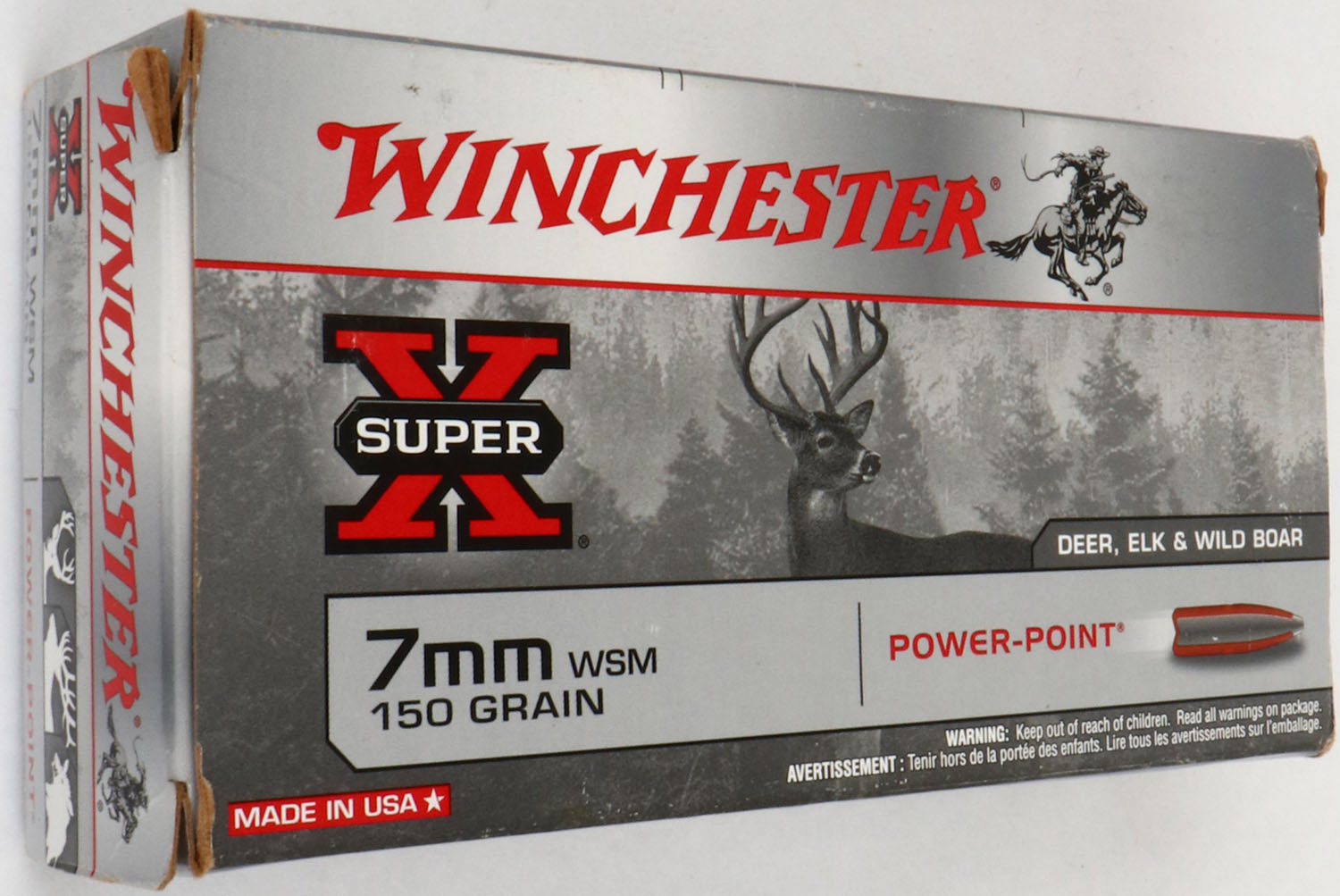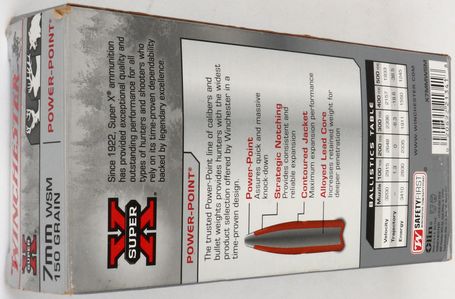 Winchester, Super X, 7mm WSM, 150 Grain Power-Point, Full, 1pc. Silver gray & red box, box is solid with minty color, very minor corner wear, edges are crisp, end flaps are solid, ammo is excellent to minty. Grade: Excellent + - Value: 12 to 48