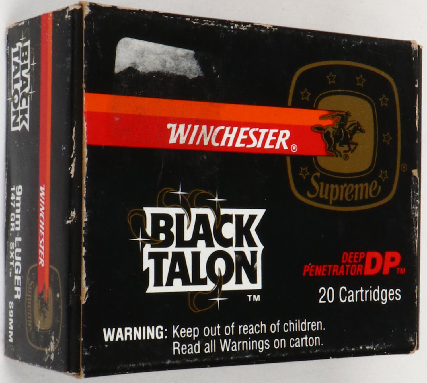 Winchester, Black Talon, 9mm Luger Hollow Point, 147 Gr. SXT, Full, 1pc. Black red & orange box, box is solid with excellent color, very minor shelf wear, very minor edge & corner wear, end flaps are solid, ammo is minty. Grade: Excellent - Value: 10 to 50
