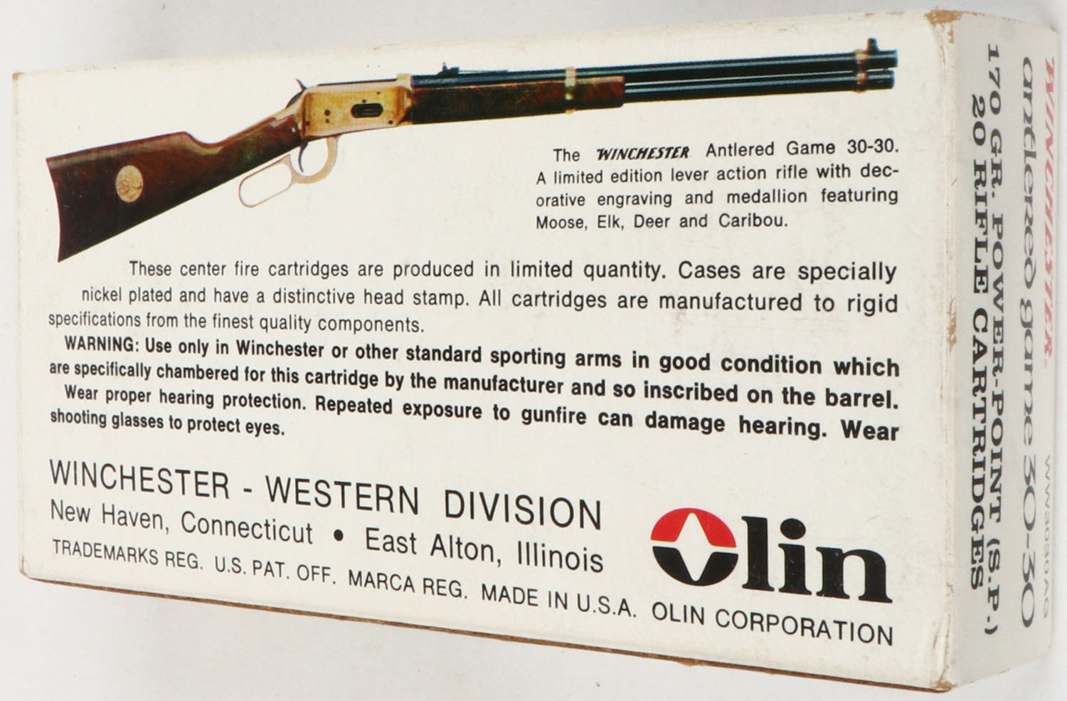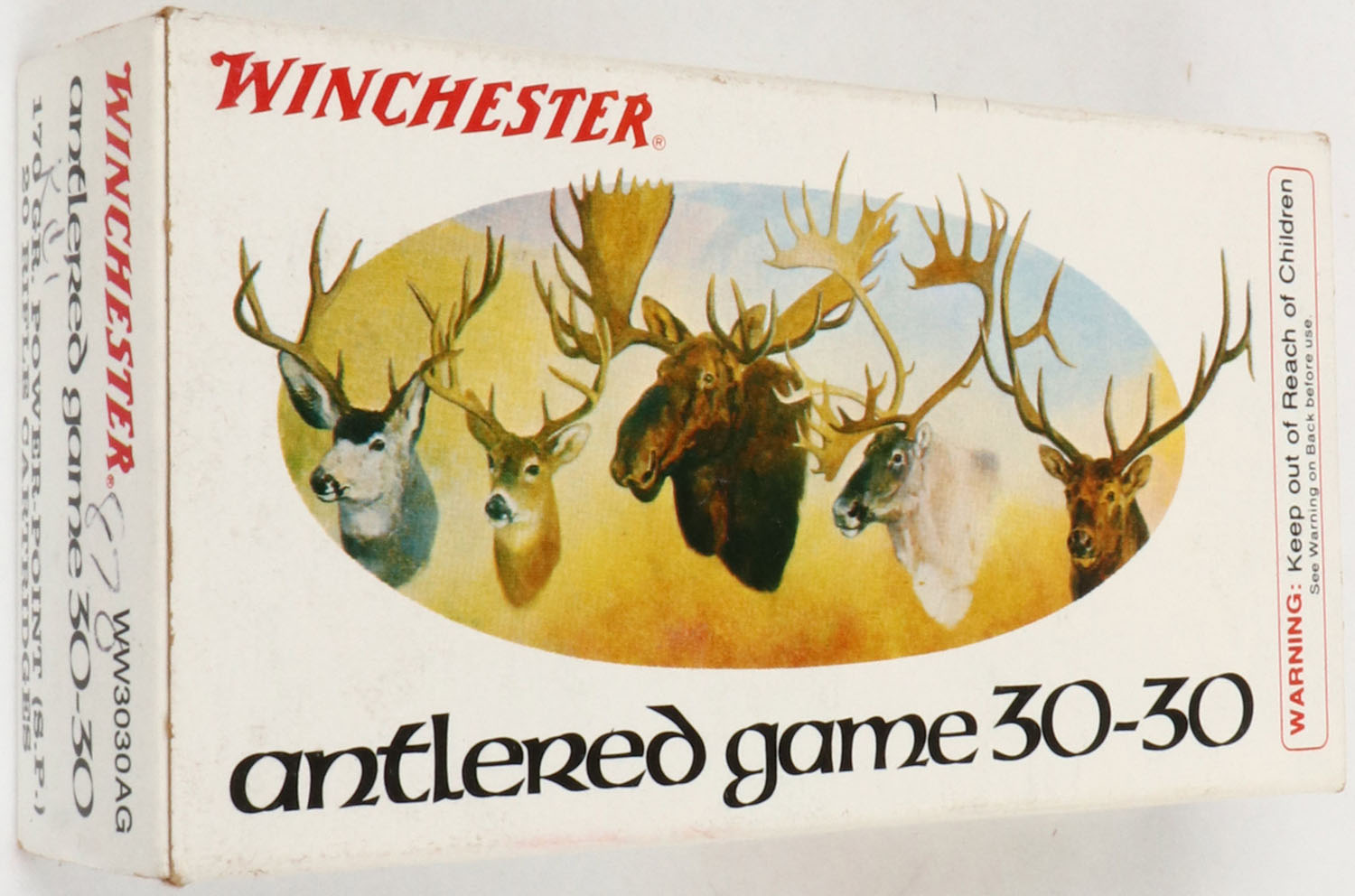 Winchester, antlered game 30-30, .30-30 Winchester, 170 Grain Power-Point (S.P), Full, 1pc. White box featuring antlered game, box is solid with excellent to minty color, very minor age soiling & corner wear, edges are crisp, end flaps are solid, ammo is excellent to minty. Grade: Excellent + - Value: 30 to 60