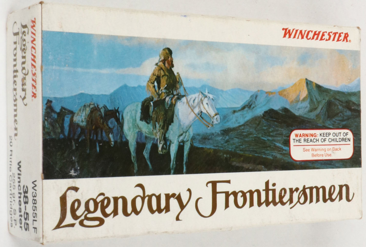 Winchester, Legendary Frontiersman, .38-55 Winchester, 255 gr. S.P., Full, 1pc. Multicolored box, box is solid with excellent color, very minor age soiling & corner wear, edges are crisp, end flaps are solid, ammo is excellent to minty. Grade: Excellent + - Value: 30 to 60