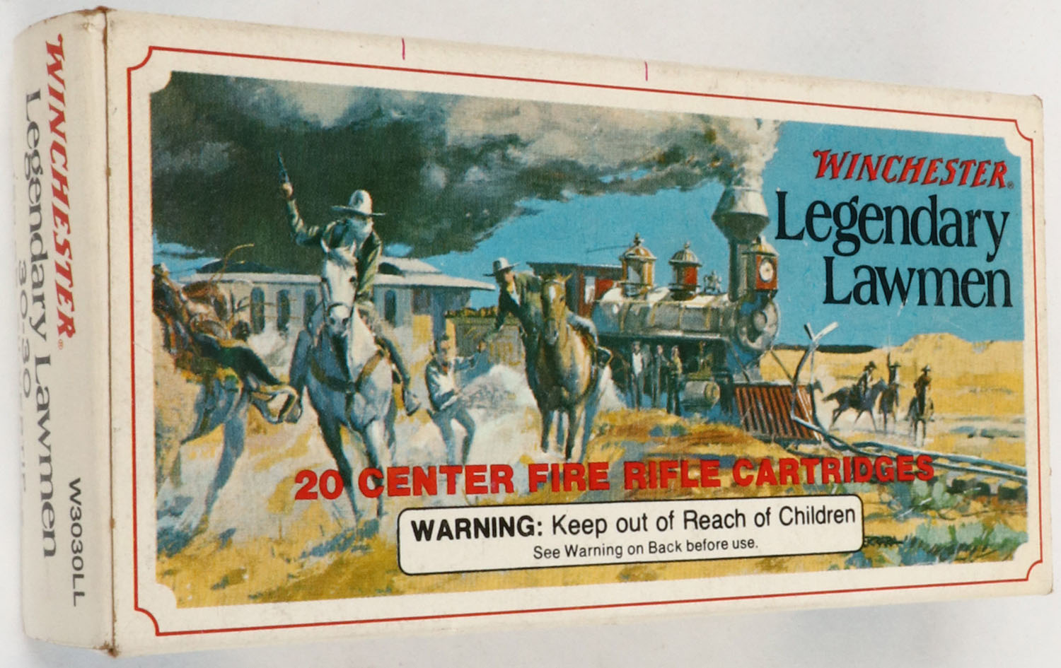 Winchester, Legendary Lawmen, .30-30 Win., 150 Gr. Silvertip, Full, 1pc. Multicolored box with French over label on front, box is solid with excellent color, very minor age soiling, corners are sharp, edges are crisp, end flaps are solid, ammo is excellent to minty. Grade: Excellent + - Value: 40 to 80