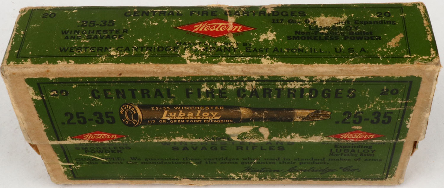 Western, .25-35 Adapted to Winchester and Savage Rifles, 117 Gr. Open Point Expanding Lubaloy Non-Fouling Bullet, FULL & SEALED, 2pc. Buff box with green labels, box is solid with excellent color, shelf wear, edge wear, labels are intact. Grade: Very Good ++ - Value: 50 to 150