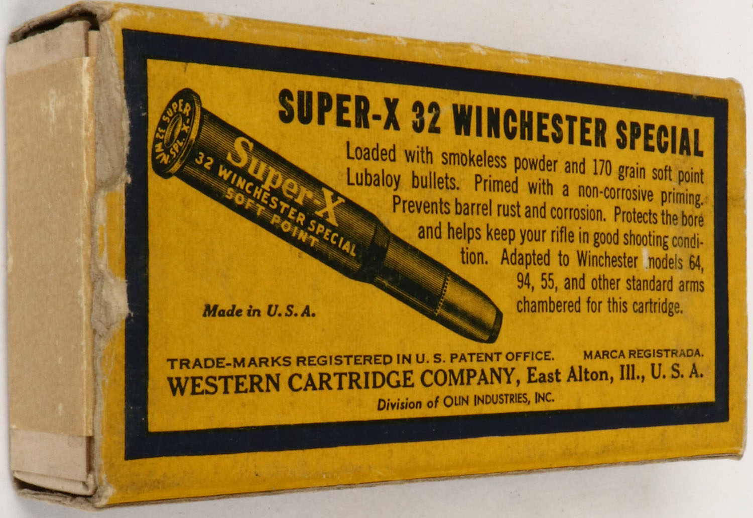 Western, Super-X, .32 Winchester Special, 170 Grain Lubaloy Bullet, Full, 1pc. Yellow blue & red box, box is missing right end flap, box has excellent color, minor age soiling, some edge & corner wear, top has been written on, ammo is excellent. (185) Grade: Very Good - Value: 30 to 60