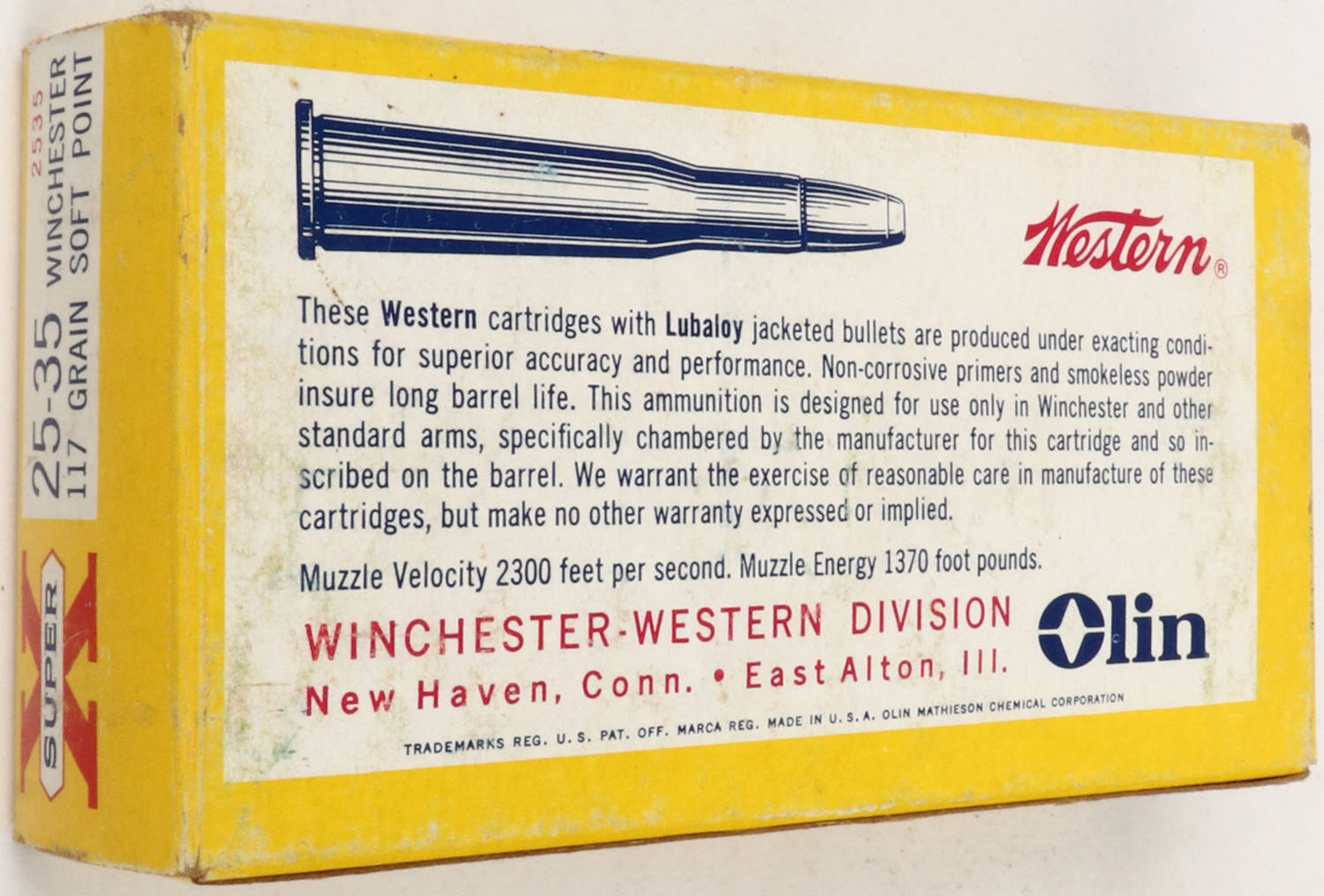Western, Super X, .25-35 Winchester, 117 Gr. Soft Point, Full, 1pc. Yellow white & red box, box is solid with excellent to minty color, very minor corner wear, edges are mostly crisp, end flaps are solid, ammo is excellent. Grade: Excellent - Value: 20 to 60