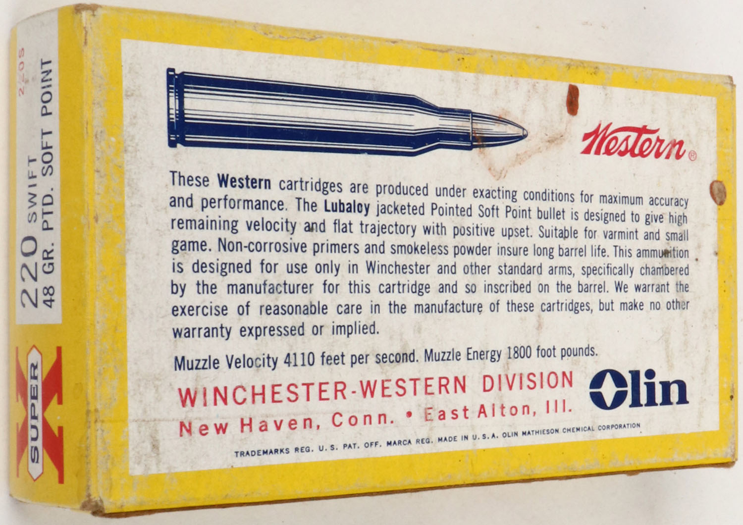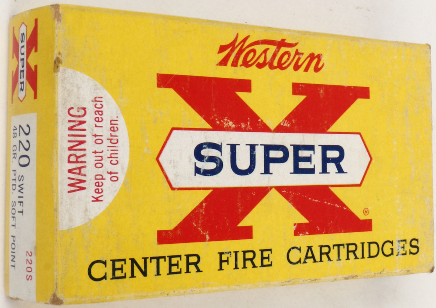 Western, Super X, .220 Swift, 49 Gr. Ptd. Soft Point, Full, 1pc. Yellow red & white box, box is solid with excellent color, some shelf wear, very minor edge & corner wear, end flaps are solid, ammo is excellent. Grade: Excellent - Value: 20 to 60