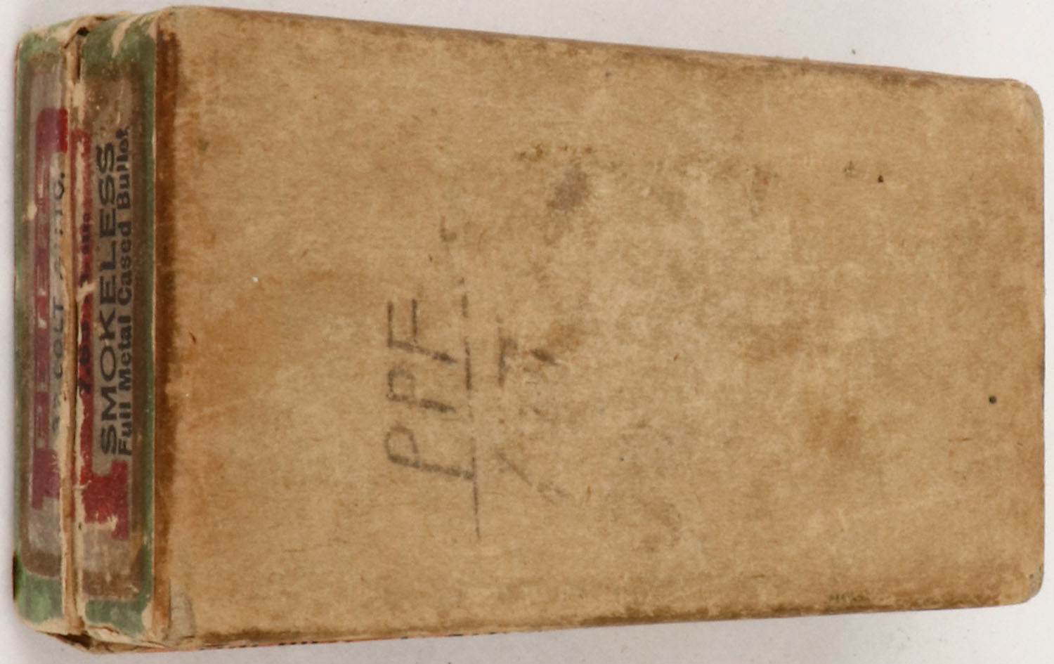 Peters, .32 Colt Automatic (7.65 m/m), Full Metal Cased Bullet, Full, 2pc. Buff box with salmon top & side sealing labels, box is solid with very good color, age soiling, edge & corner wear, 2 seam splits to left corners of lid, left end of lid is glued to box, ammo is excellent. Grade: Very Good - Value: 40 to 120