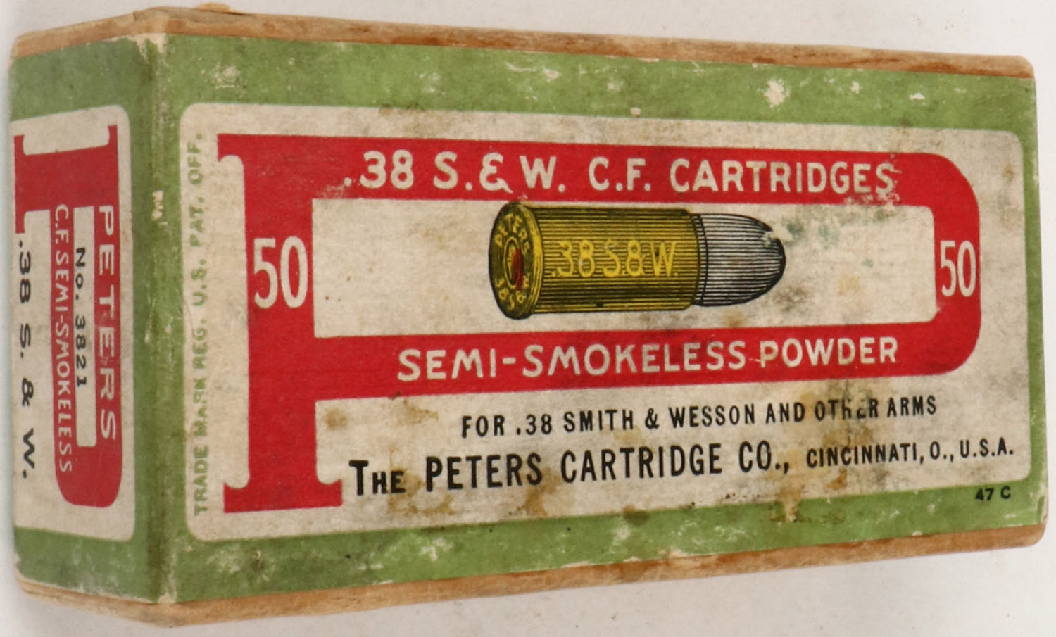Peters, .38 S&W, Semi-Smokeless Powder, Full, 2pc. Buff box with white red & green wraparound label, box is solid with very good to excellent color, minor age soiling, very minor shelf & corner wear, staining to top, sticker on bottom, label is intact, ammo is very good. Grade: Excellent - Value: 30 to 120