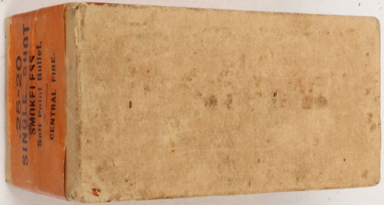 Peters, .25-20 Single Shot, Soft Point Bullet, FULL & SEALED, 2pc. Buff box with orange top & side sealing labels, box is solid with excellent color, minor age soiling, very minor shelf & corner wear, edges are mostly crisp, labels are intact. Grade: Excellent - Value: 100 to 300