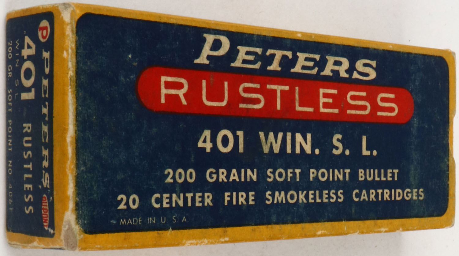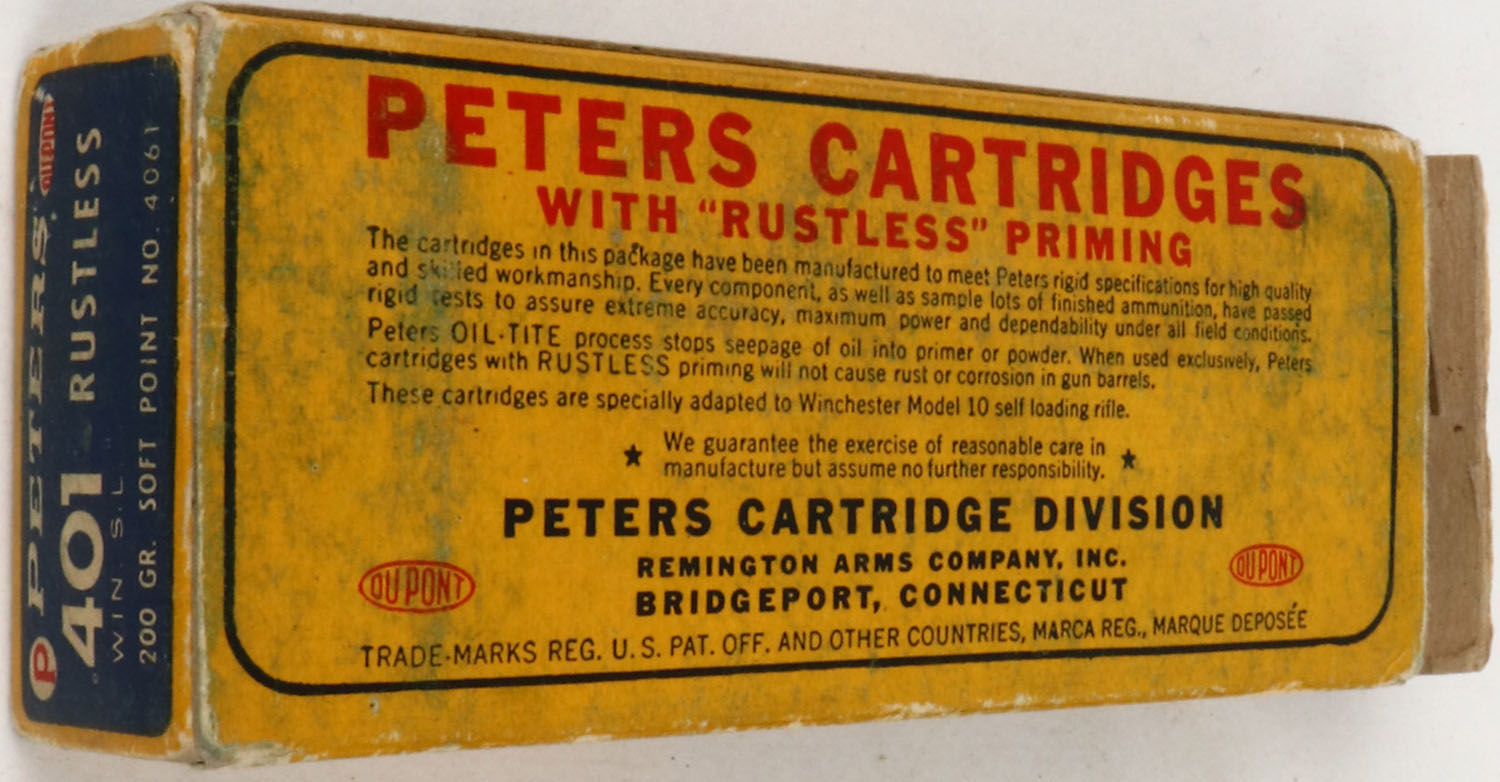 Peters, Rustless, .401 Win. S.L., 200 Grain Soft Point Bullet, Partial 18rds. Correct, 1pc. Blue yellow & red box, box is solid with excellent color, some age soiling & shelf wear, right end flap is torn, corner wear, very minor edge wear, ammo is excellent. Grade: Very Good + - Value: 80 to 160
