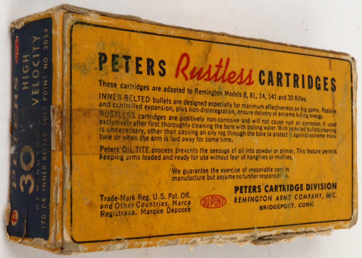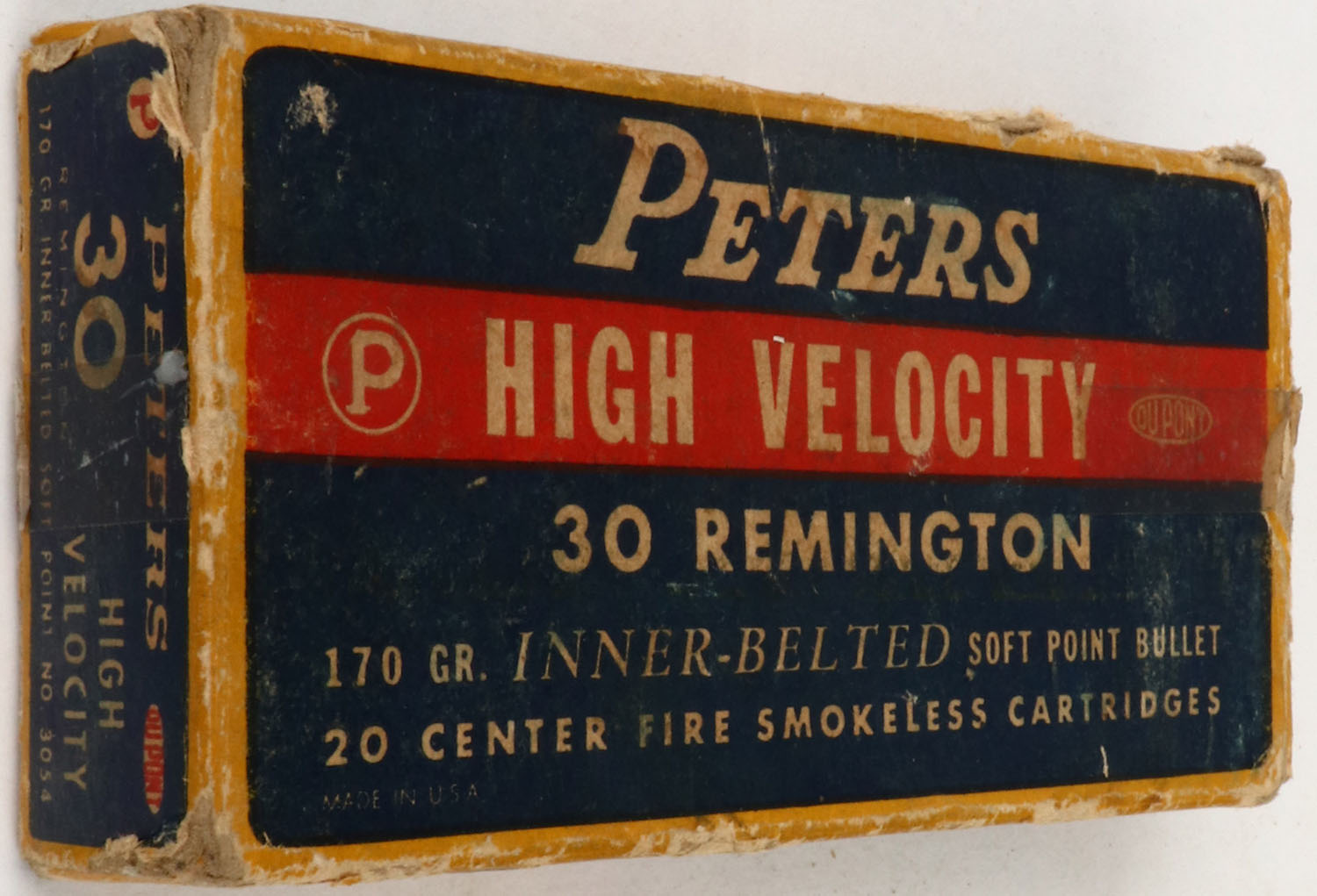 Peters, High Velocity, .30 Remington, 170 Gr. Inner-Belted Soft Point Bullet, Partial 19rds. 1pc. Blue yellow & red box, box is solid with very good color, age soiling, edge & corner wear, end flaps are solid, ammo is excellent. Grade: Very Good + - Value: 10 to 50