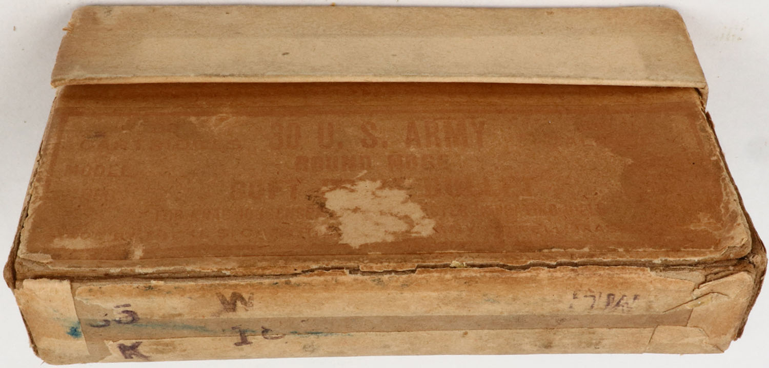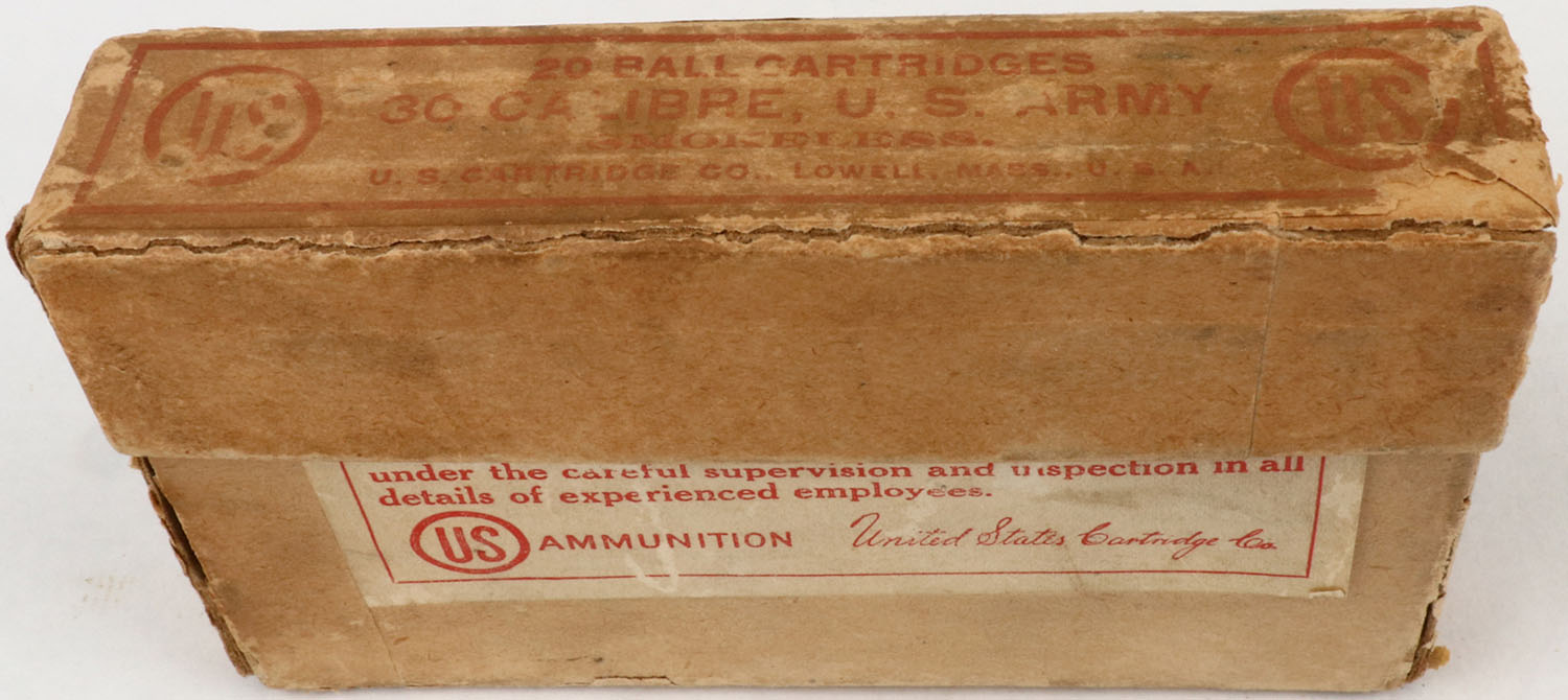 U.S. Cart. Co., .30 U.S. Army, Smokeless, Full, 2pc. Buff box with buff & red labels, box is mostly solid with good color, age soiling, edge & corner wear, shelf wear, several partial seam splits, right end of lid is torn, labels are intact, ammo is excellent. Grade: Very Good - Value: 20 to 60