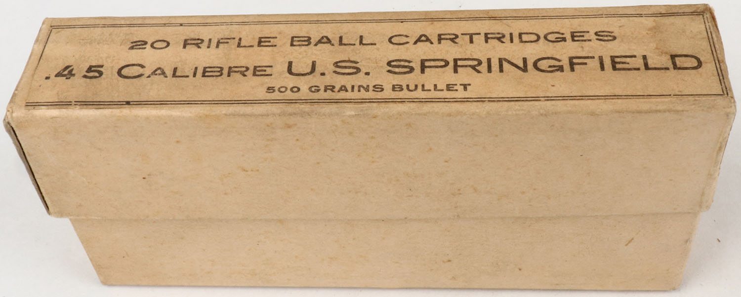 U.S. Cart. Co., .45 Calibre U.S. Springfield, 500 Grains Bullet, Full, 2pc. Buff box with buff & black label, box is solid with excellent color, very minor age soiling & corner wear, edges are mostly crisp, label is intact, ammo is excellent. Grade: Excellent - Value: 30 to 120