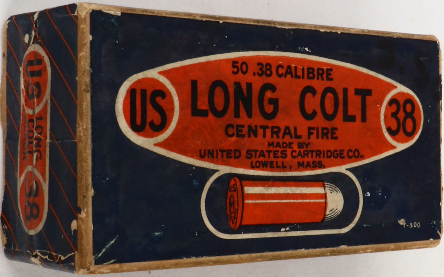 U.S. Cart. Co., .38 Long Colt, Black Powder, Full & Mostly Sealed, 2pc. Blue & orange box, box is solid with excellent color, age soiling, right end of lid is torn, 2 partial seam splits to back and right end of bottom, minor edge & corner wear, ammo appears good to very good. Grade: Very Good + - Value: 20 to 80