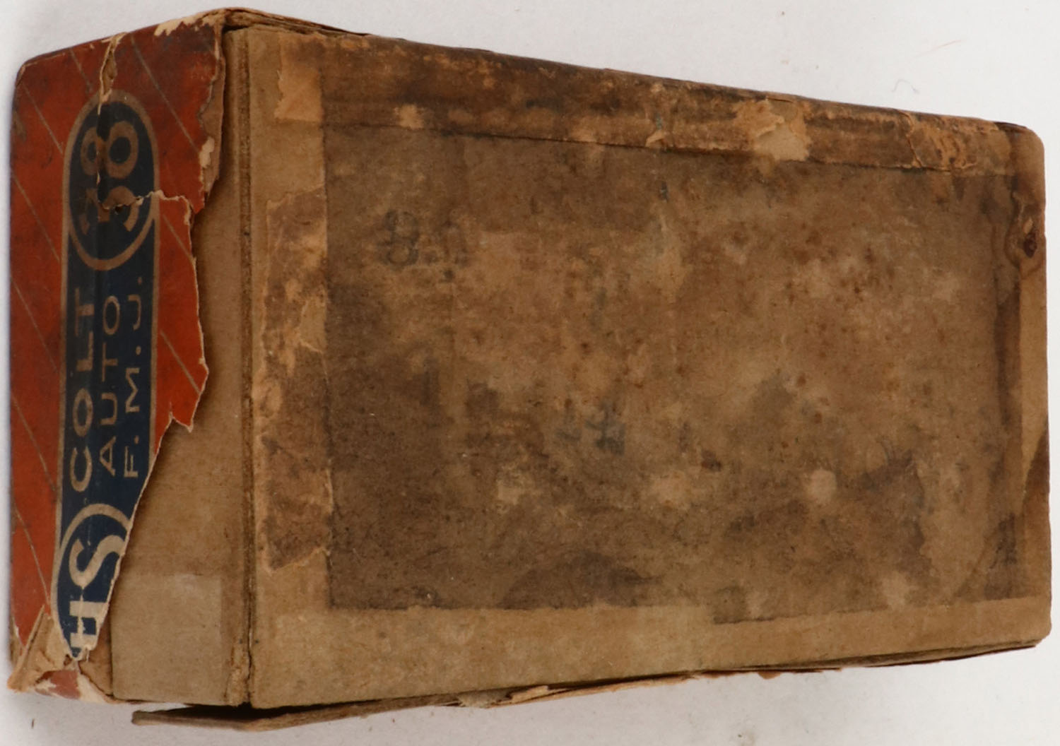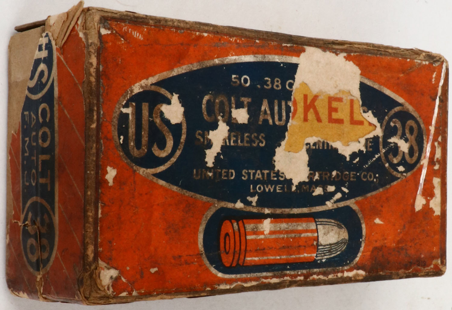 U.S. Cart. Co., .38 Colt Automatic, Smokeless, Full Metal Jacket, Full & Partially Sealed, 2pc. Orange & blue box, box has several seam splits and has torn labels, age soiling, edge & corner wear, torn top label, seam splits to bottom edges, ammo appears very good to excellent. (1459) Grade: Good - Value: 10 to 50