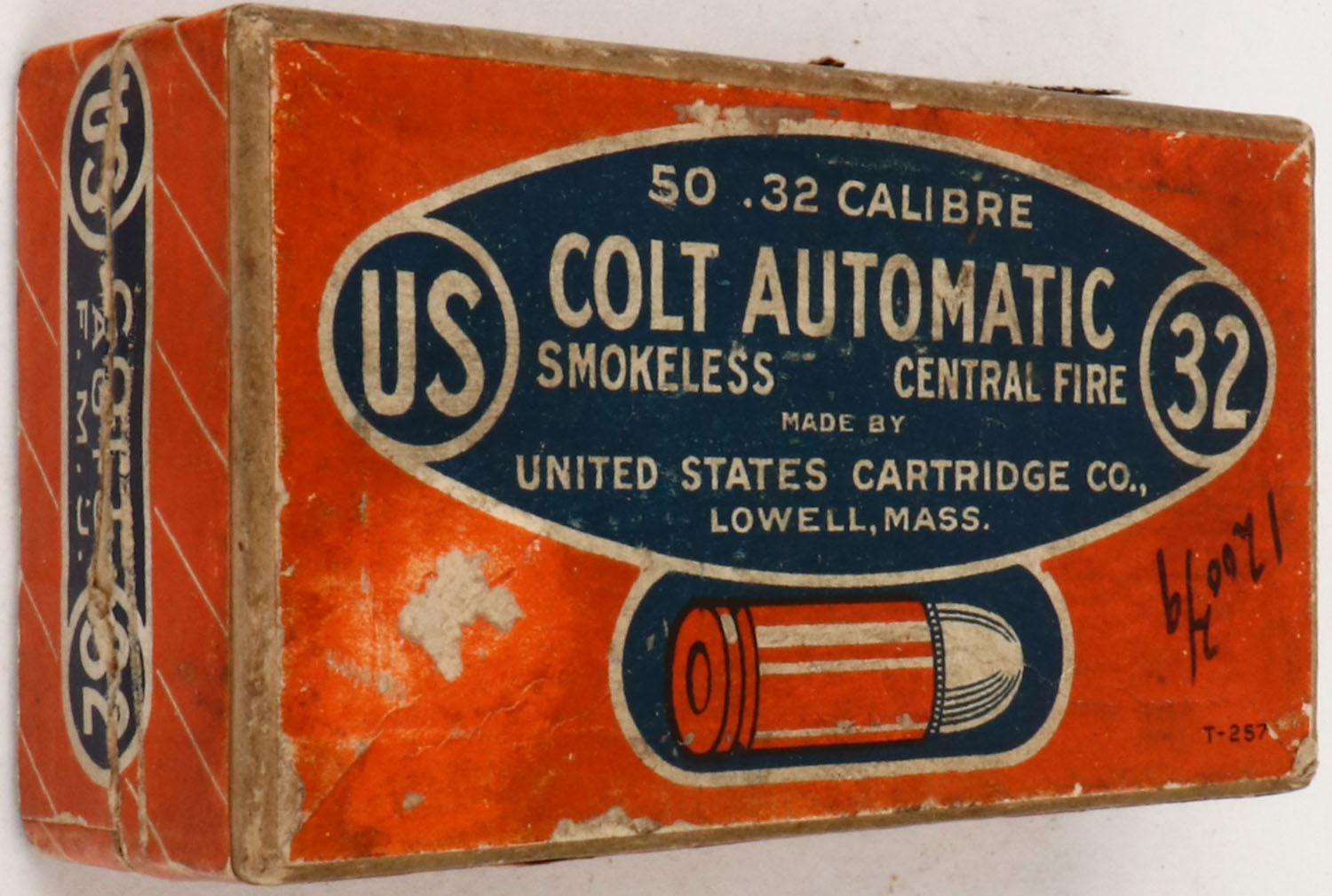 U.S. Cart. Co., .32 Colt Automatic, Smokeless, Full Metal Jacket, Full, 2pc. Orange blue & white box, box is solid with excellent color, some age soiling, minor edge & corner wear, top has been written on, some shelf wear, ammo is excellent. Grade: Very Good ++ - Value: 20 to 60