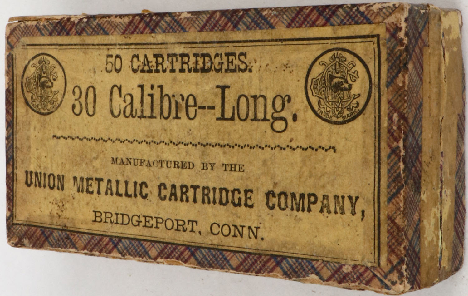 UMC, .30 Calibre--Long., Rim Fire, Partial 46rds. 2pc. Fabric box with buff labels, box is solid with excellent color, some age soiling, edge & corner wear, labels are 95% intact, ammo is good to very good. Grade: Very Good - Value: 20 to 120