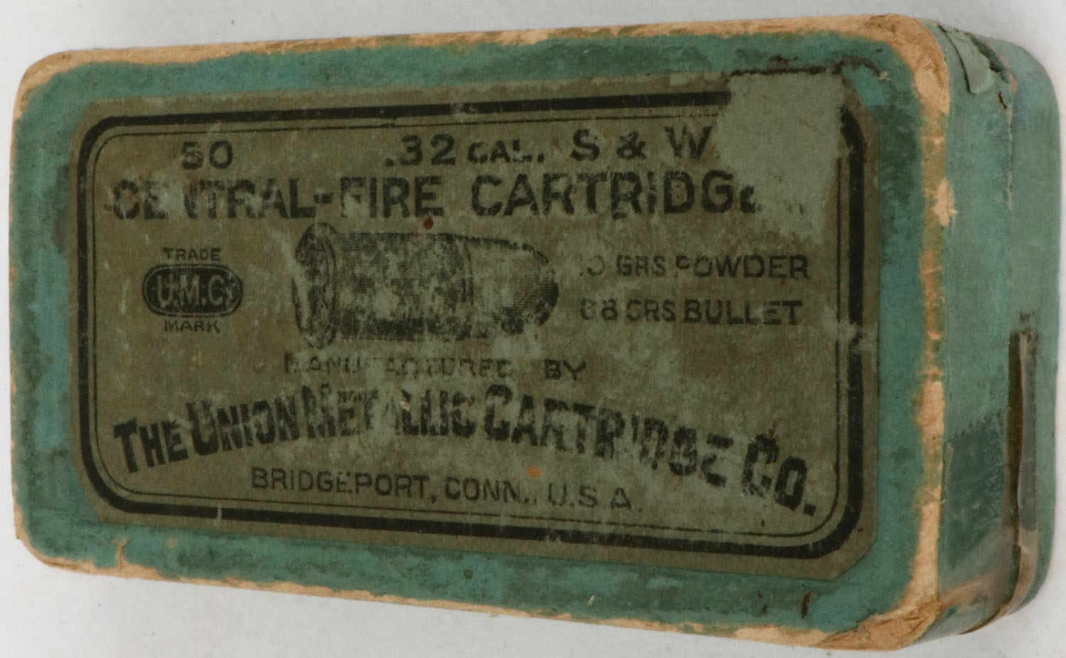 UMC, .32 S&W, 88 Grs. Bullet, Full, 2pc. Blue box with blue top label, box is solid with very good color, age soiling, edge & corner wear, side sealing label is mostly gone, shelf wear, ammo is very good. (976) Grade: Good ++ - Value: 10 to 60