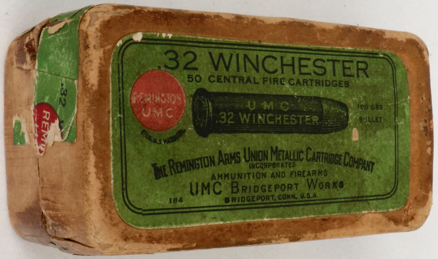 REM-UMC, .32 Winchester, Black Powder, 100 Grs. Bullet, Full, 2pc. Buff box with green top & side sealing labels, box is solid with excellent color, age soiling, some edge & corner wear, minor shelf wear, side sealing label is 90% intact, ammo is good to very good. Grade: Very Good - Value: 20 to 100