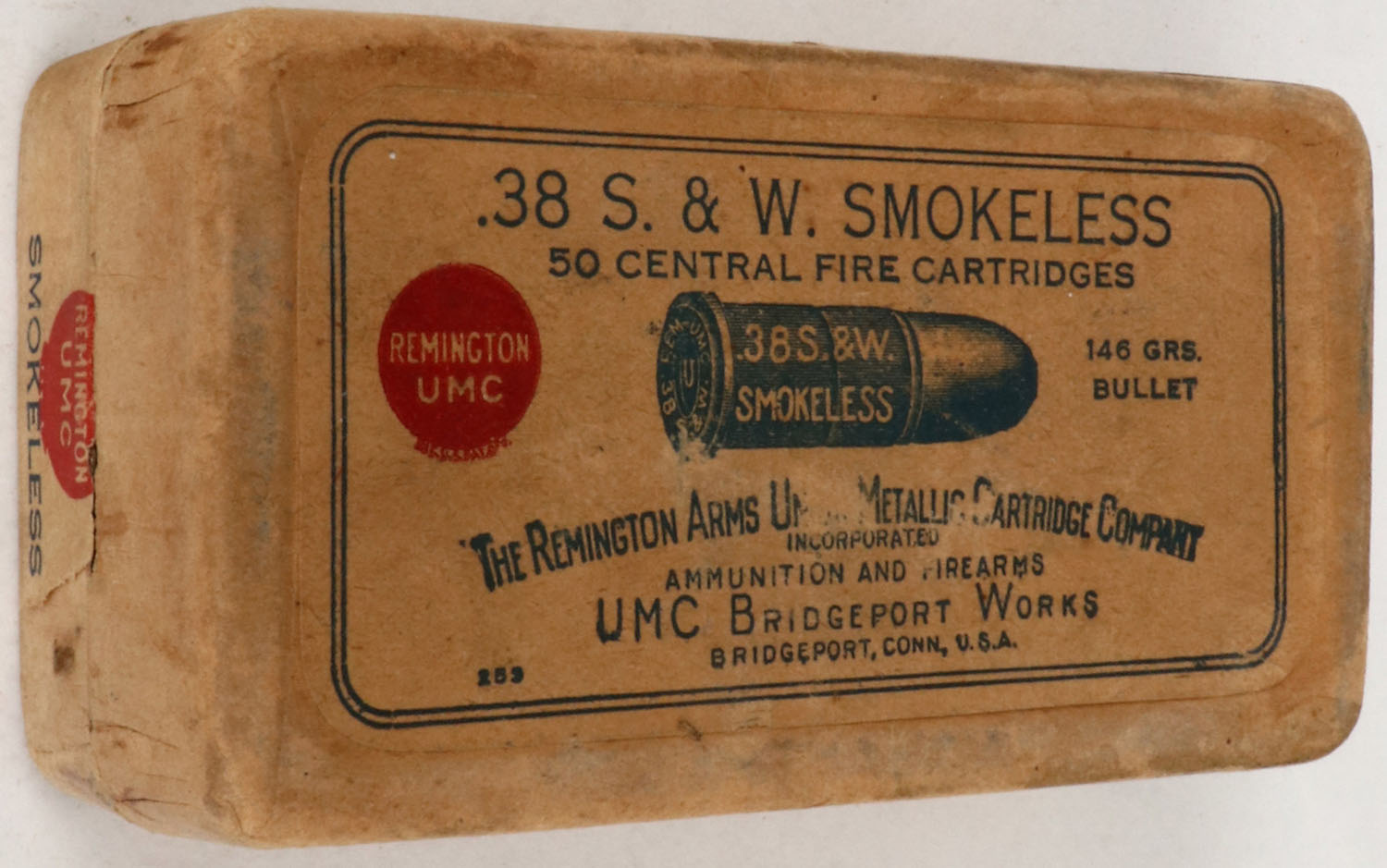 REM-UMC, .38 S. & W. Smokeless, Central Fire Cartridges, 146 Grs. Bullet, 2pc, Full, buff box/label & black/red print, box is solid with excellent color, parts of left end & side labels missing, very minor edge wear & light corner wear, ammo is excellent. (138) Grade: Very Good + - Value: 30 to 90