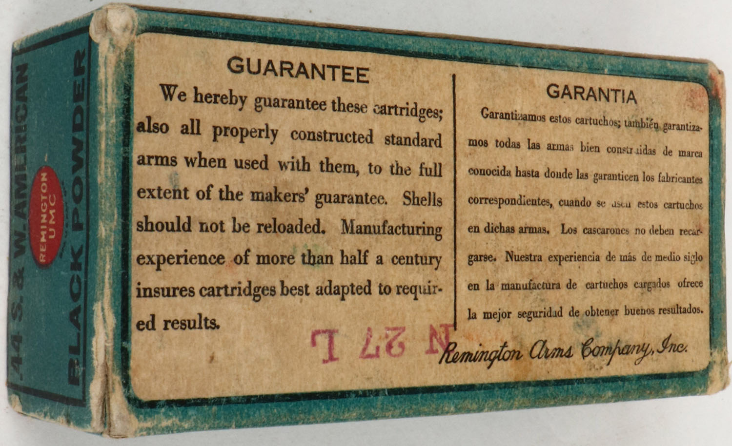 REM-UMC, .44 S&W American, 218 Grains Bullet, Full, 1pc. Blue black & red box, box is solid with very good color, age soiling, insert tab of left end flap is torn, some edge & corner wear, minor shelf wear, ammo is good. Grade: Very Good - Value: 20 to 100