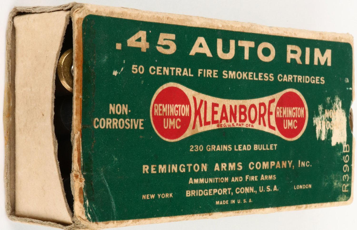 Remington, Kleanbore, .45 Auto Rim, 230 Grains Lead Bullet, Partial 48rds., 1pc. Green white & red dog bone box, box is missing both end flaps, has excellent color with only very minor age soiling, some staining to left end, very minor shelf & corner wear, ammo is excellent. Grade : Very Good - Value: 20 to 80