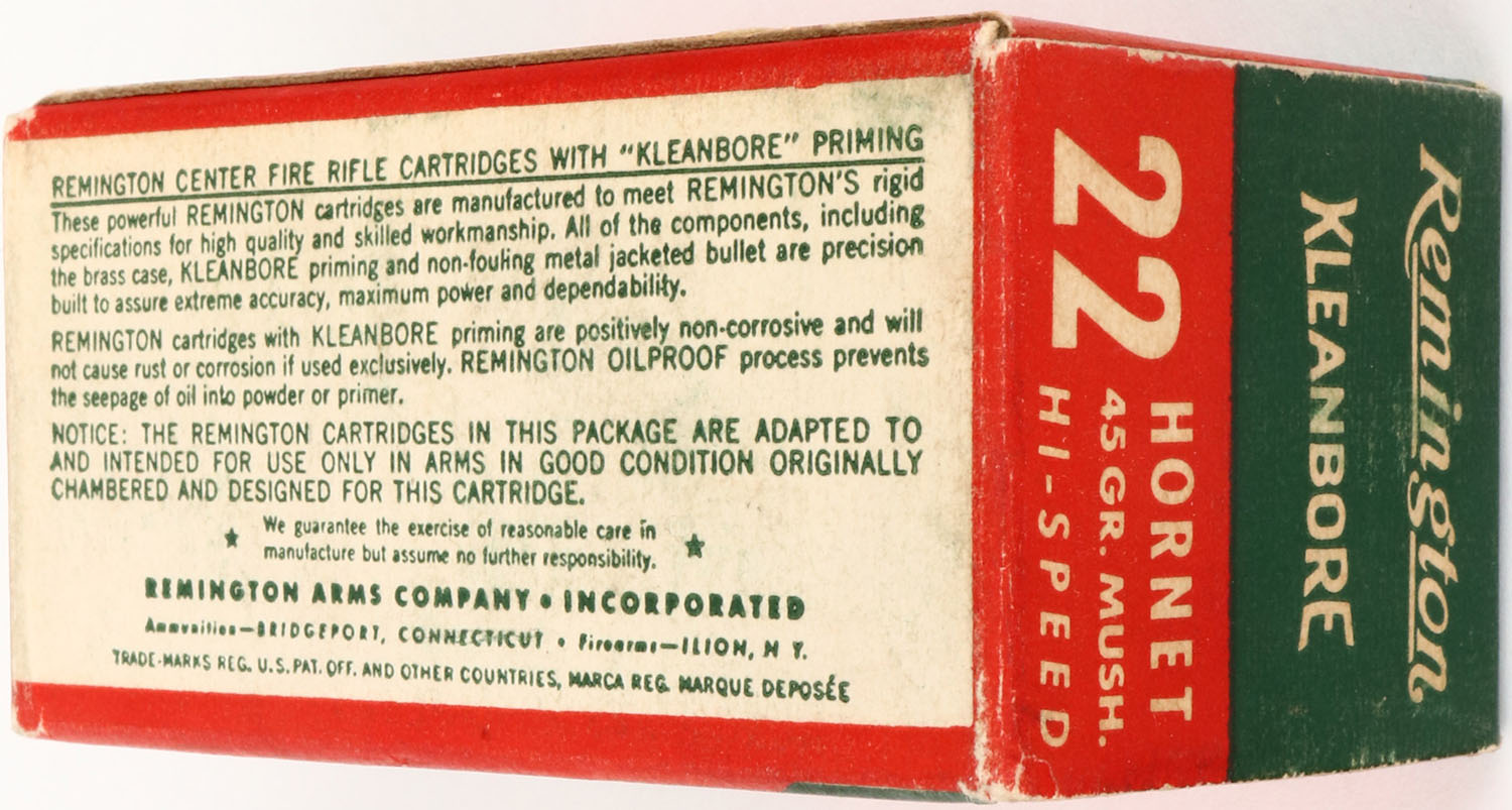 Remington, Kleanbore Hi-Speed, Full, 1pc. Green red & white box, box is solid with excellent color, very minor corner wear, edges are crisp, end flaps are solid, ammo is excellent. Grade: Excellent - Value: 40 to 80