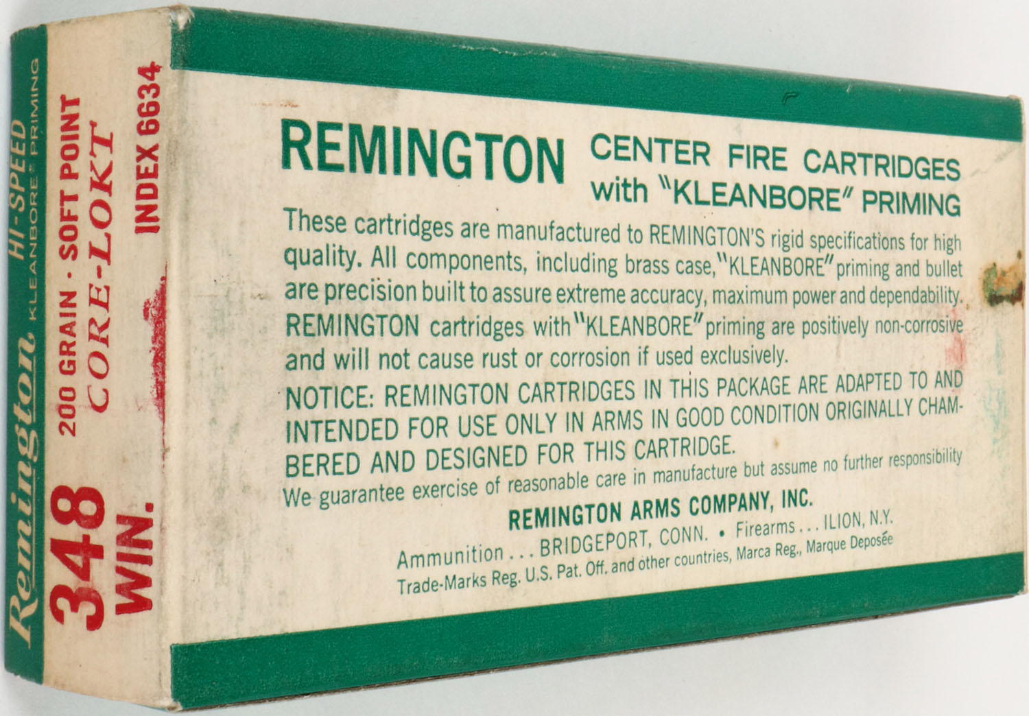 Remington, Hi-Speed, .348 Win., 200 Grain Soft Point Core-Lokt Bullet, Full, 1pc. Green white & red box, box is solid with excellent color, minor age soiling & shelf wear, very minor corner wear, edges are crisp, end flaps are solid, top has been written on, ammo is excellent. Grade: Very Good ++ - Value: 20 to 60