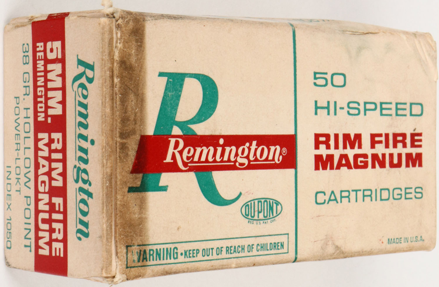 Remington, Hi-Speed Rim Fire Magnum, 5mm Remington, 38 Gr. Hollow Point, Power-Lokt, Full, 1pc. White red & green box, box is solid with excellent color, minor age soiling, staining to left end, corner ding on top right corner, minor edge & corner wear, end flaps are solid, ammo is excellent. Grade: Very Good ++ - Value: 20 to 60