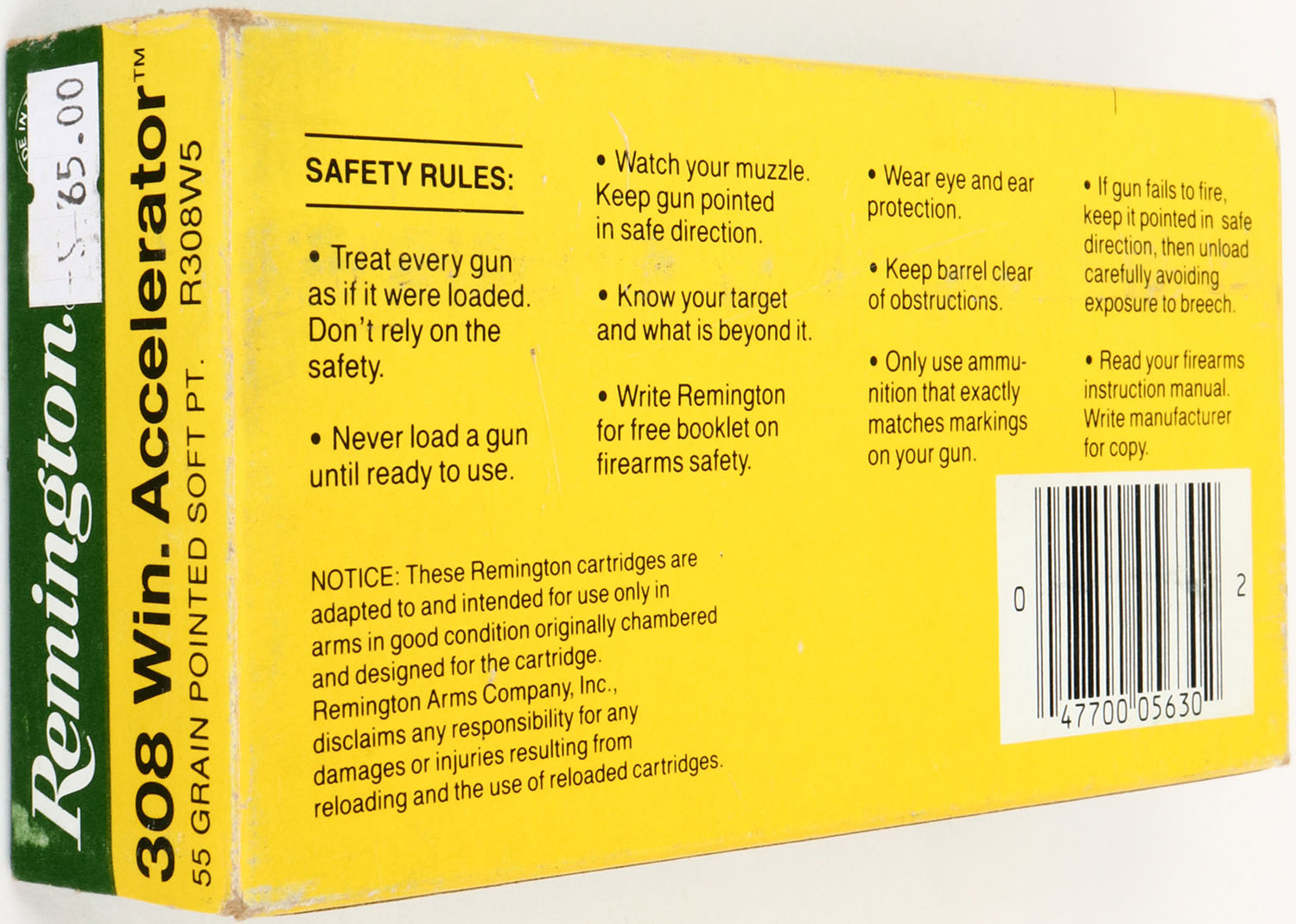 Remington, Accelerator, .308 Win. Accelerator, 55 Grain Pointed Soft Pt., Full, 1pc. Green yellow & white box, box is solid with excellent color, very minor shelf & corner wear, edges are mostly crisp, end flaps are solid, ammo is excellent. Grade: Excellent - Value: 10 to 50