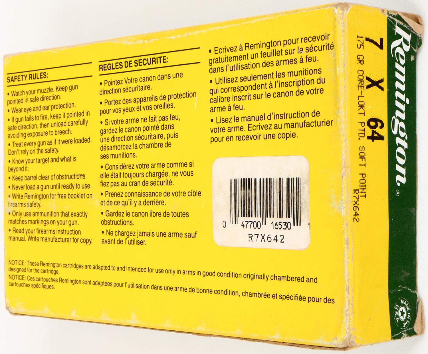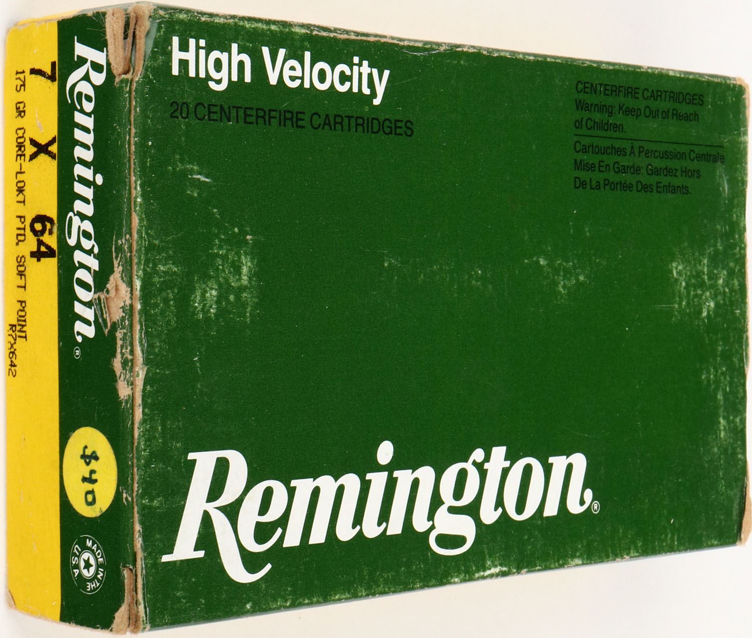 Remington, High Velocity, 7 x 64mm, 175 Gr. Core-Lokt Ptd. Soft Point, Full, 1pc. Green yellow & white box, box is solid with excellent color, minor corner wear, very minor shelf & edge wear, end flaps are solid, ammo is excellent. Grade: Very Good ++ - Value: 20 to 60