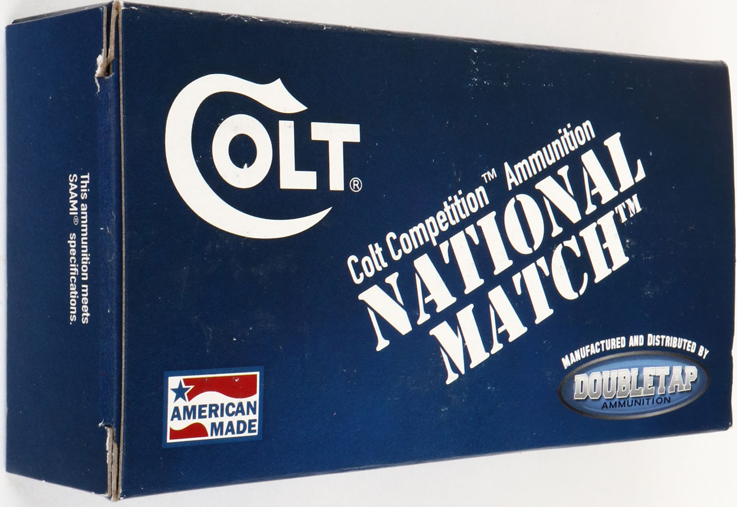 DoubleTap, 9mm, 124 Grain FMJ-RN, Colt National Match, 1pc, Full, blue box with white print, box is solid with excellent color, light rub marks, edges are crisp, end flaps are solid, ammo is excellent. Grade: Excellent + - Value: 20 to 60