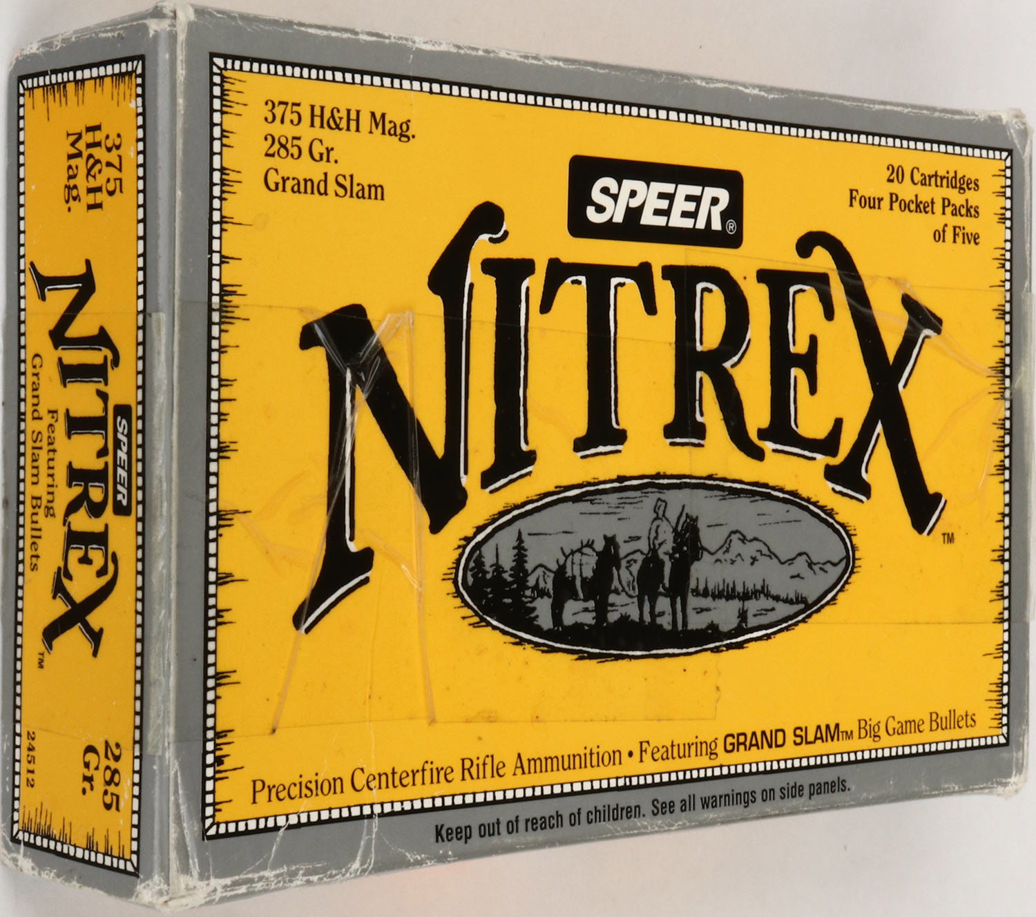 Speer Nitrex, .375 H&H Mag, 265 Gr. Grand Slam Bullets, 1pc, Full in ''Pocket'' pouches of five rounds inside bigger box, silver/yellow box with black print, box is solid with excellent color, tape, sticker marks, light rub marks, light edge wear & light corner wear, ammo is excellent. Grade: Very Good ++ - Value: 30 to 120