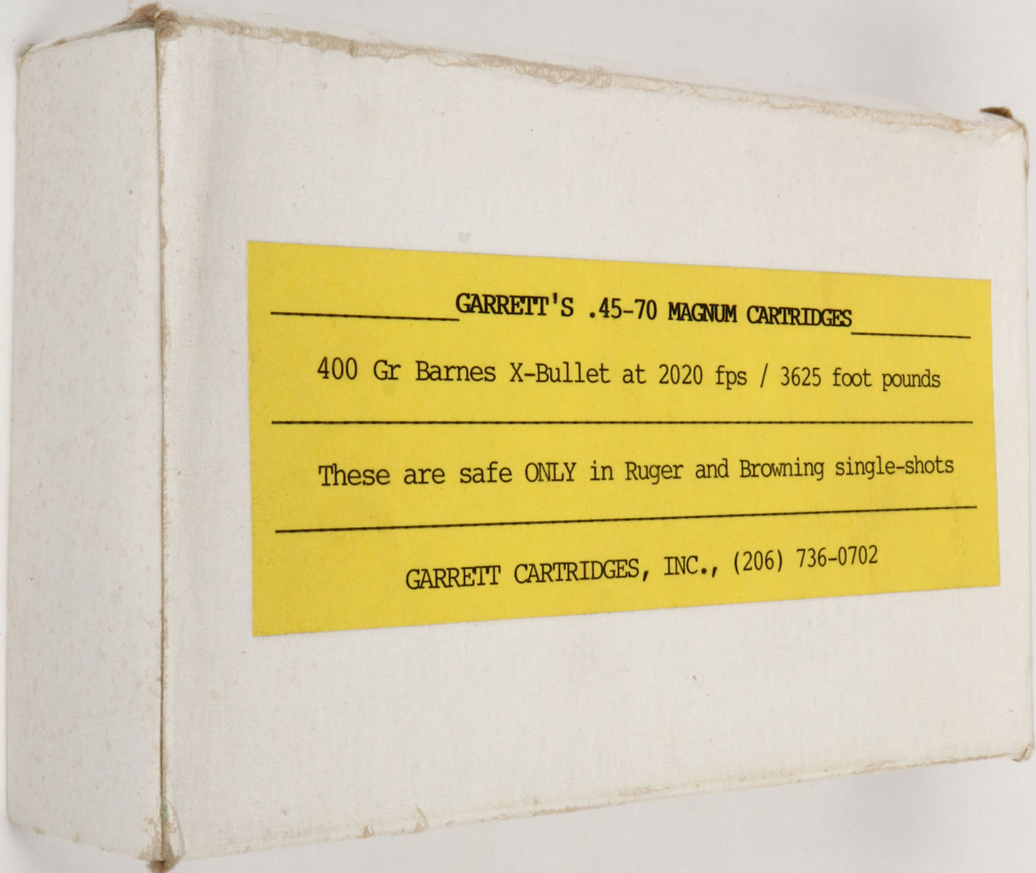 Garrett Cartridges INC., .45-70 Magnum, 400 Gr. Barnes X-Bullet, 1pc, Full, white box with yellow label & black print, box is solid with light rub marks & light edge wear, ammo is excellent. Grade: Excellent - Value: 30 to 120