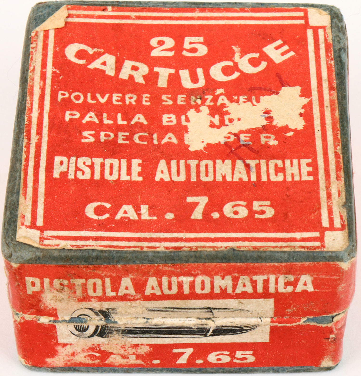 Societa Italiana Munizoni, 7.65 Pistole Automatiche, 2pc, Full, Blue box with red label & white print, box is solid with pencil marks, rub marks, very good box color & crisp edges, ammo is very good. (1275) Grade: Very Good ++ - Value: 10 to 100