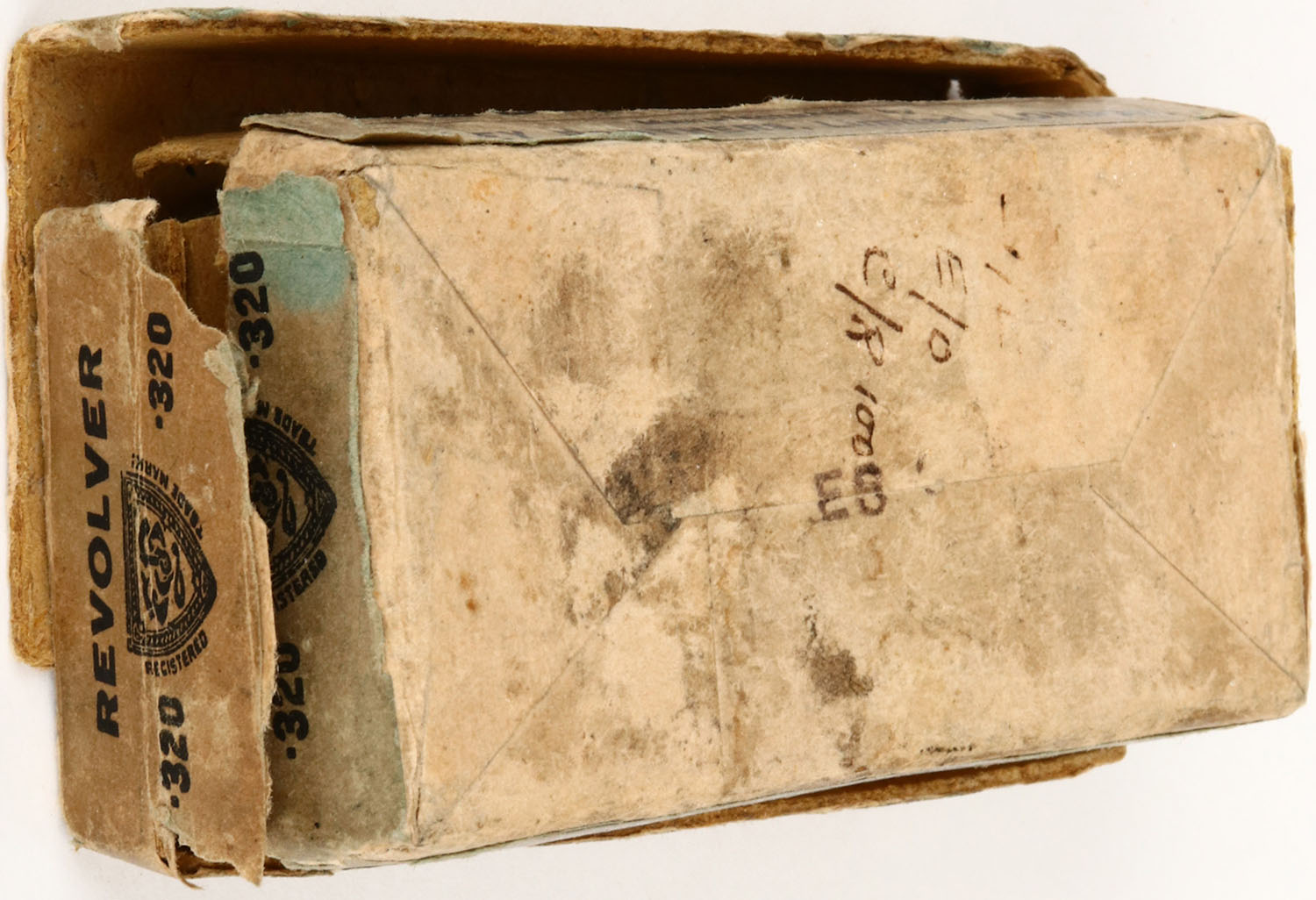 ELEY, .32, Black Powder, 2pc, Full, buff box & label with black print, box is falling apart with multiple seam tears, pieces of box missing & detached, age soiling, rubbing marks & edge wear, ammo is good. (1399) Grade: Good + - Value: 20 to 60