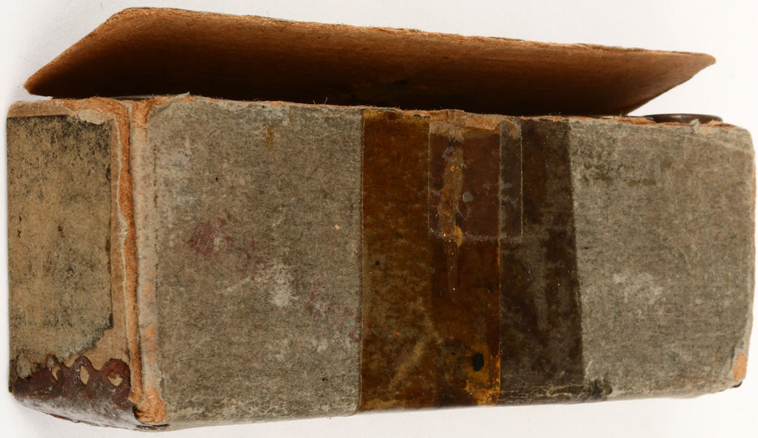 DWM, 9mm, 1pc, Full, buff box with blue label & black print, box has lid taped on, piece of label missing, light age soiling, rub marks & light edge wear, ammo is very good. (915) Grade: Very Good + - Value: 10 to 30