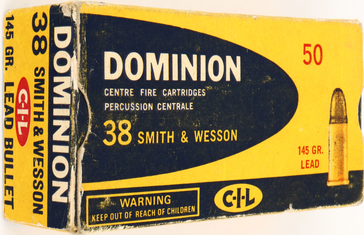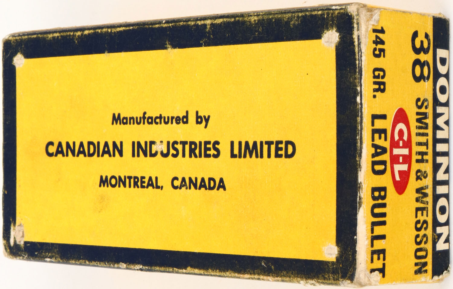 CIL, .38 S&W, 145 Gr. Lead Bullet, 1pc, Full, yellow box with blue label & white print, box is solid with rub marks, edge wear, light corner wear & light handling marks, ammo is excellent. Grade: Excellent - Value: 20 to 60
