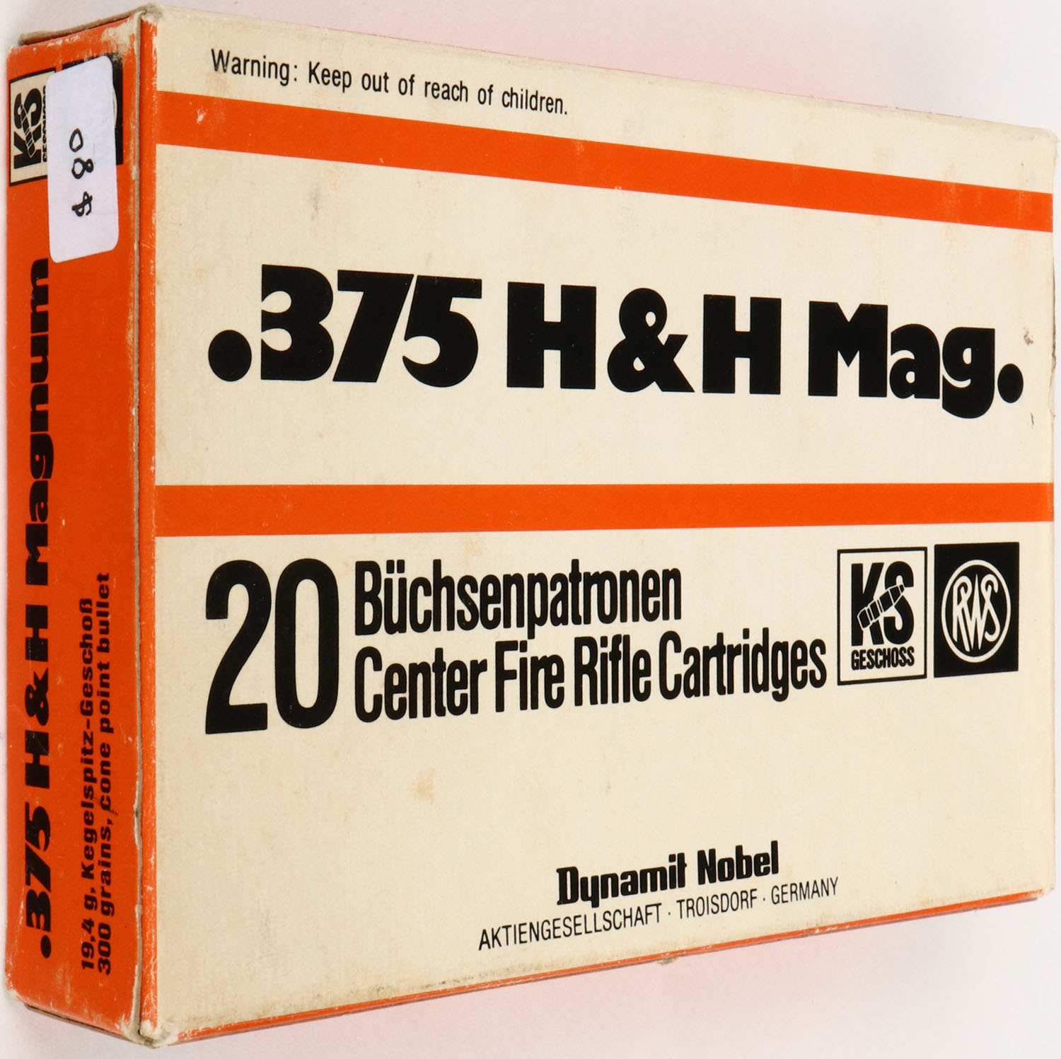 SINOXID, .375 H&H Mag., 1pc, Full, white/orange box with black print, box is solid with sticker on end, sticker mark on other end, light rub marks & light edge wear, ammo is excellent. Grade: Excellent + - Value: 30 to 90