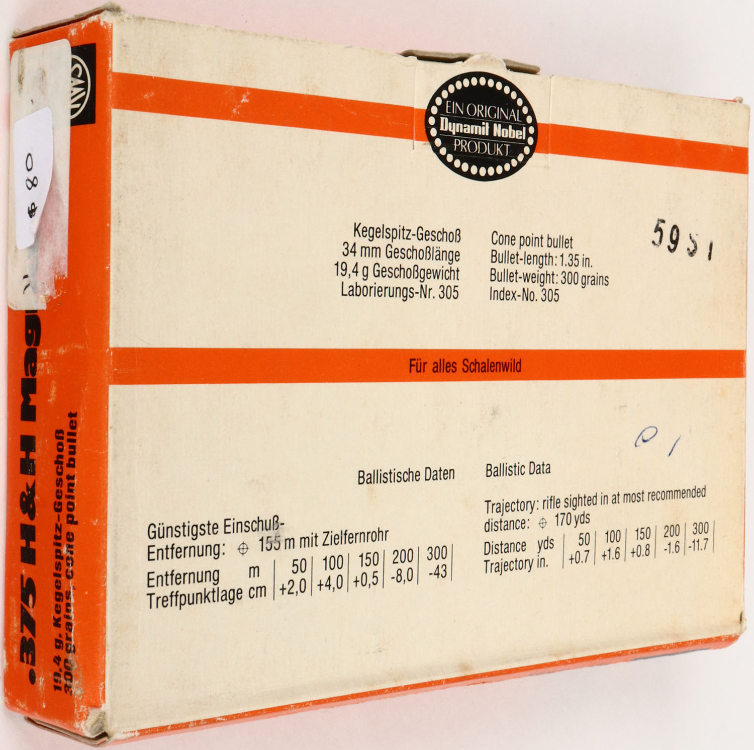 SINOXID, .375 H&H Mag., 1pc, Full, white/orange box with black print, box is solid with sticker & sticker mark on end, light rub marks & light edge wear, ammo is excellent. Grade: Excellent + - Value: 30 to 90