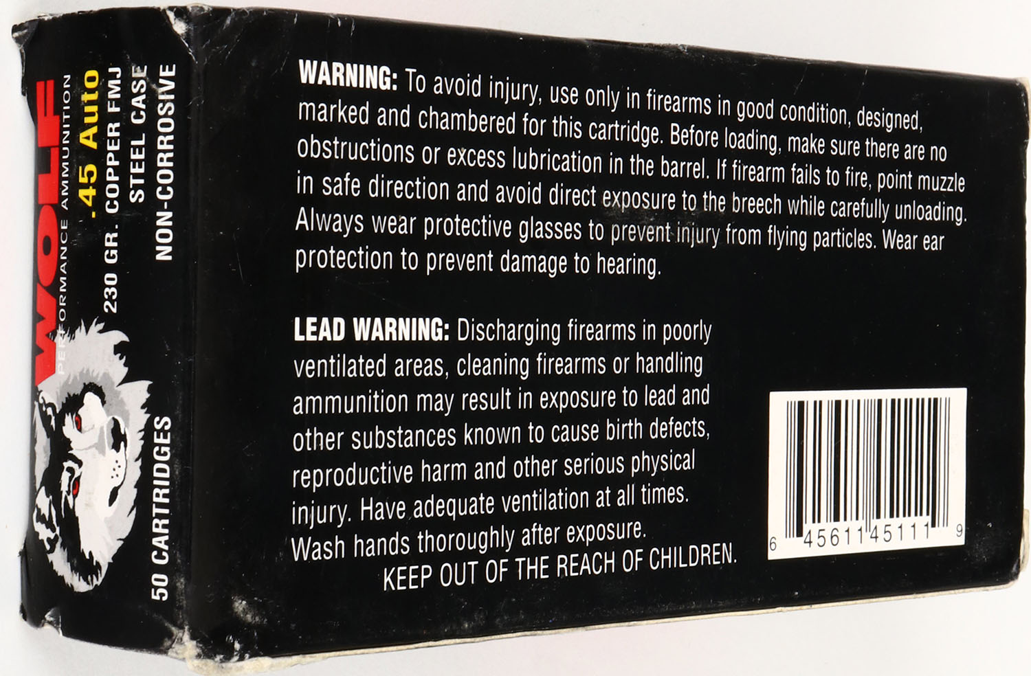 Wolf, .45 Auto, 230 Gr. Copper FMJ, Steel Case, 1pc, Full, black box with white/red/yellow print, box is solid with light wear, ammo is MINT. Grade: Excellent + - Value: 20 to 60