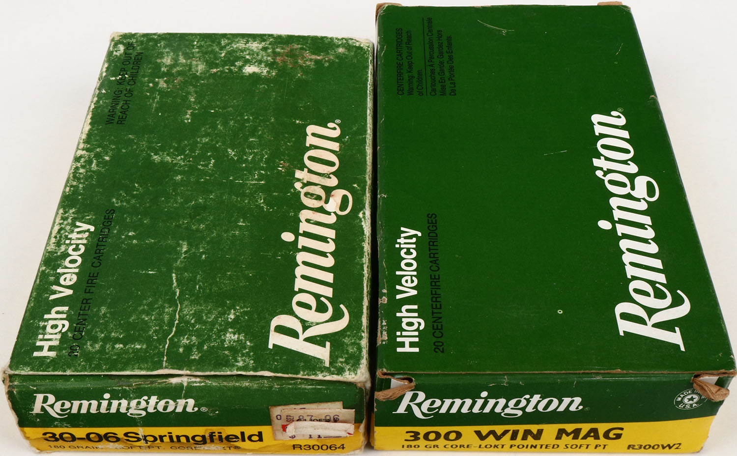 Remington, Lot of (2) boxes, (1) .30-06 Springfield, Full, box is solid with wear, ammo is excellent, (1) .300 Win. Mag., Partial 13rds. of Mixed H/S, box is solid, ammo is excellent. Grade: Excellent - Value: 20 to 80