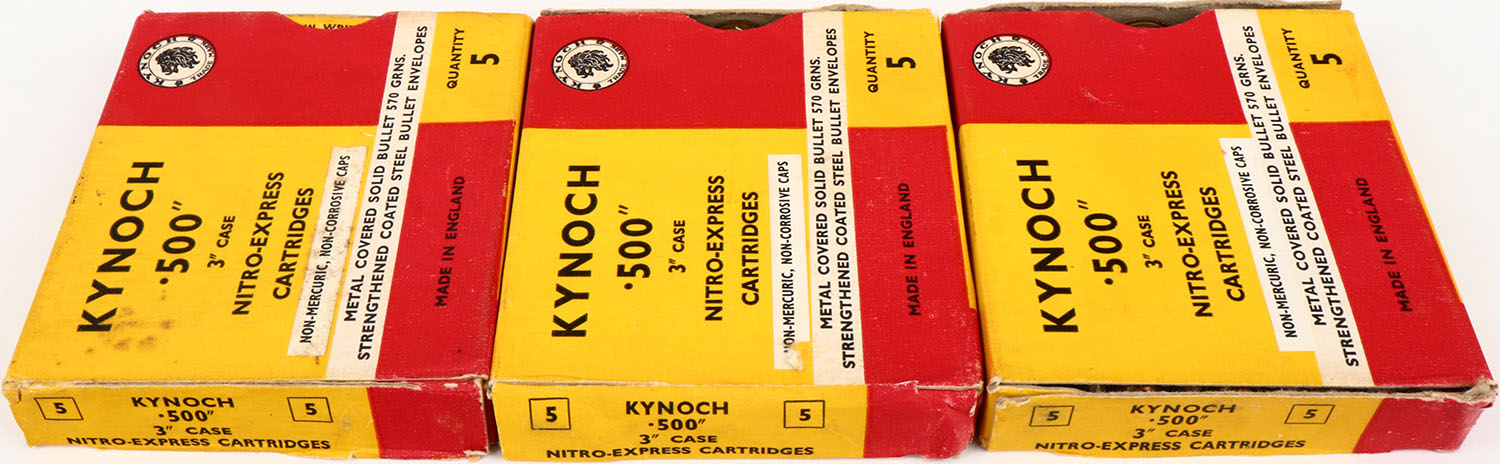 Kynoch, Lot of (3) boxes of .500 Nitro-Express, 3'' Case, Boxes are solid, some have torn end flaps, ammo is excellent. (10922) Grade: Excellent + - Value: 30 to 120