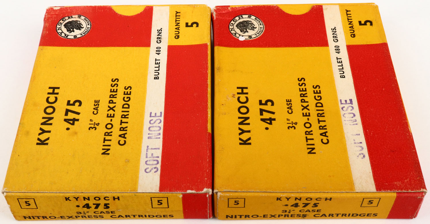 Kynoch, Lot of (2) boxes of .475 Nitro-Express, 3 1/4'' Case, Boxes are solid, some have torn end flaps, ammo is excellent. (10925) Grade: Excellent + - Value: 20 to 100