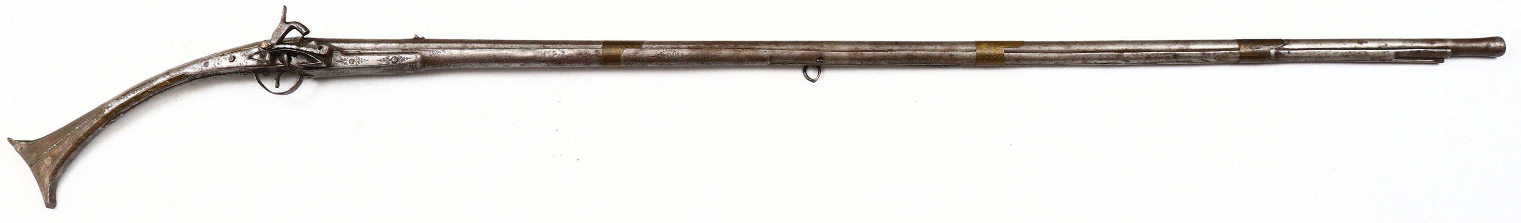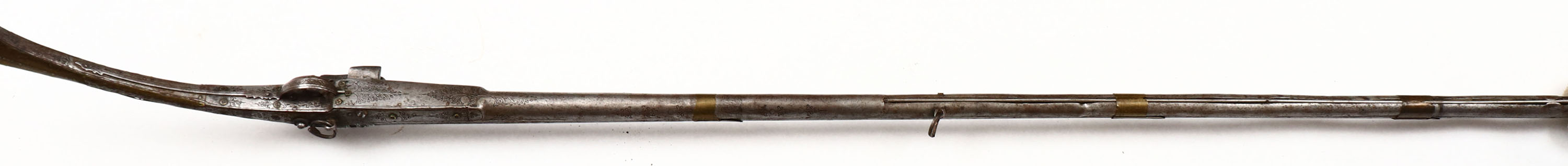 Afghan, Jezail, CAL: .67. MFG: Unknown, S/N: N/A, Percussion Muzzleloader, 52'' round barrel. The metal stock is very good with ornamental engraving & brass plating that is pealing up in spots, has rust speckling & patina. The metal is worn to a gun metal gray & has rust speckling, thin brass barrel bands with engraving. Bore is poor with rust & pitting. No front sight, U-notch rear sight. Side mounted sling rings, comes with ramrod. Missing percussion nipple. These Jezail rifles were all handmade & come in many shapes & sizes. Antique, No FFL Req. - Value: 200 to 1000