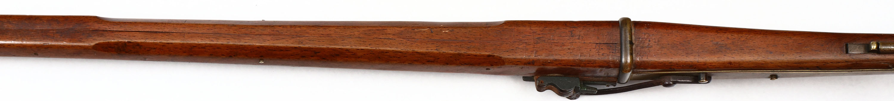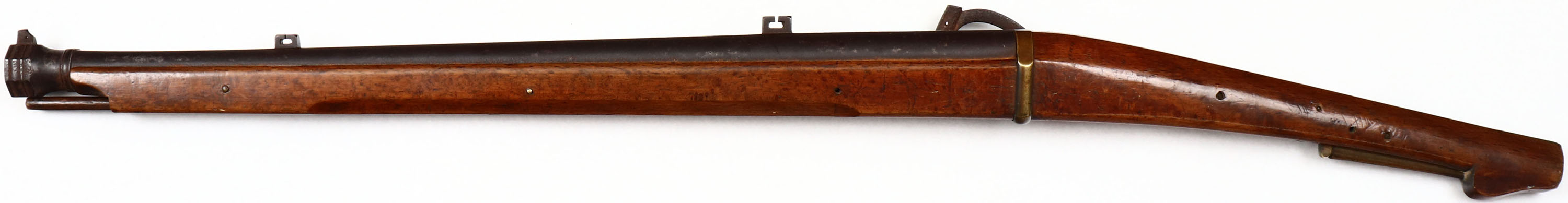 Japanese, Matchlock Hand Cannon, CAL: N/A, MFG: 16th Century, SN: N/A, Matchlock Gun, 27 3/8'' Barrel. The wooden stock is very good, with crack running end to end from bottom of forend alongside rub marks, nicks, dings & overall wear from use & age. The metal finish has fully toned to a brown patina. Barrel has Japanese lettering on top. Bore is poor, dark & pitted. The barrel holds a barleycorn front sight & two rear groove sights. No buttplate. Antique, No FFL Req - Value: 1000 to 2000