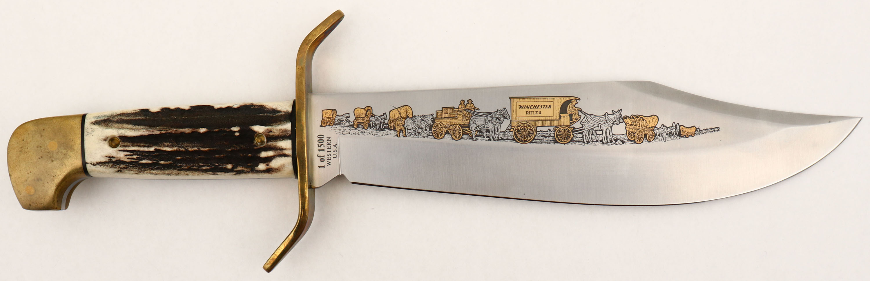 OUTSTANDING Winchester Model 94 Texas Sesquicentennial Rifle & Bowie Knife Cased Set , marked .38-55 WIN Cal., MFG. 1986, SN: TSR0239, Lever Action Rifle, 24'' Round barrel, Full mag. This is a fantastic Winchester collectible set celebrating the 150 yr anniversary, 1836-1986, of Texas being a state. Limited Edition, 1 of 1500. The original deluxe & checkered wood stocks are excellent, displaying fantastic grain. The high gloss original finish is also excellent, with virtually no handling marks. The original factory high luster blue finish rates 100%. The receiver, barrel & lever all carry wonderful gold embellishments. Bore is mint. Barrel fitted with the original front & rear sights. Crescent metal buttplate. Comes with a 14.5'' Bowie Knife, which is fitted with wonderful stag grips & also carries similar Winchester, Western, & Texas themed gold embellishments on each side of the blade. Rifle & knife come stored in the original hardwood display case. Case is fantastic both in quality & condition. This is a very fine collectible set. FFL Req. - Value: 2000 to 4000