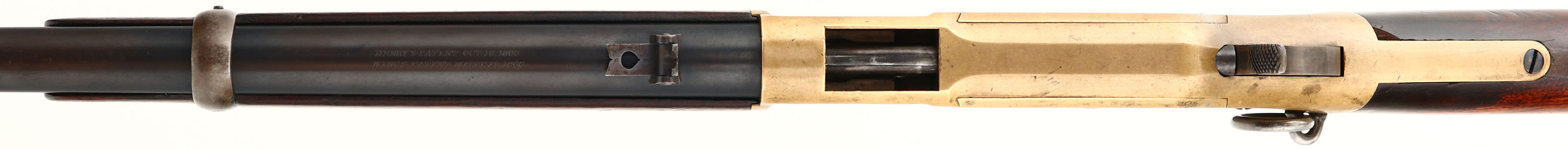 Winchester, Model 1866 Saddle Ring Carbine, 2nd variation, .44 Henry Cal., MFG. 1869, SN: 21808, Lever Action Rifle, 20'' Round barrel, Full mag. Rare early carbine with a Henry marked barrel. The address atop the barrel is still very sharp. The original wood stocks are excellent & solid. The stocks original finish has thinned & darkened from use & oils, with some added oils or protective finish. Stock has a repaired chip in the upper left corner of the tang & a small missing chip at the right corner. There are handling marks, scrapes & small contusions. The barrel & mag display 85% coverage of what appears to be the original metal blue finish, with some added finish in areas of previous wear or light pitting. The blue is starting to tone to a brown patina in areas of thinning. The lever & hammer retain muted remains of case-colors. The brass receiver & buttplate have a nicely aged patina. Bore is excellent. The barrel carries the original flip-up rear sight, with 1,3 & 5 markings for 100, 300 & 500 YDS & a standard pinch blade barrel band front sight. Stock carries a brass trapdoor crescent buttplate. A staple mounted saddle ring is located on the left side of the receiver. The numbers ''282'' are stamped on the rear portion of the right side of receiver. The SN is stamped on the lower tang. Tight, smooth action & appears mechanically sound. This early 1866 SRC has a wonderful aged appearance & these rifles are hard to find in this well maintained condition.* Antique, No FFL Req. - Value: 15000 to 18000